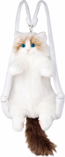 A cute plush backpack in the shape of a cat combines practical carrying with a soft cuddly toy. It features realistic details with shiny eyes, adjustable straps for comfort, and a zippered pocket on the back for small items. Ideal for walks, trips, and everyday use.
