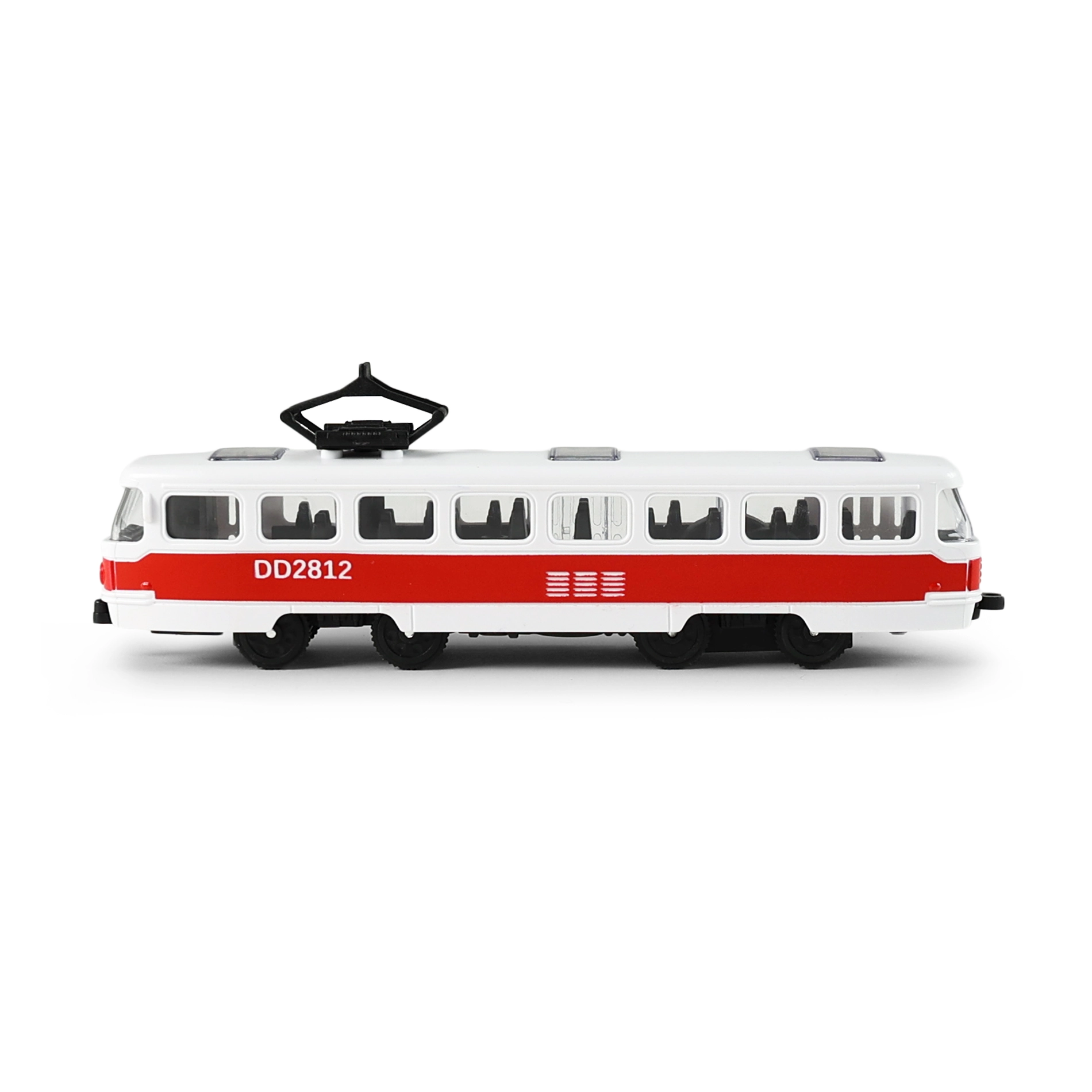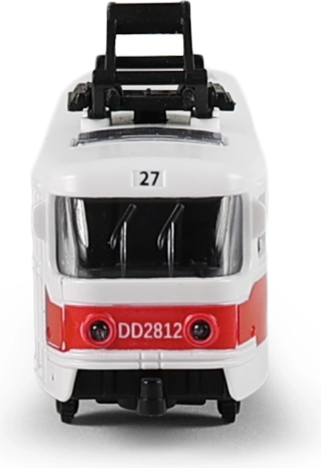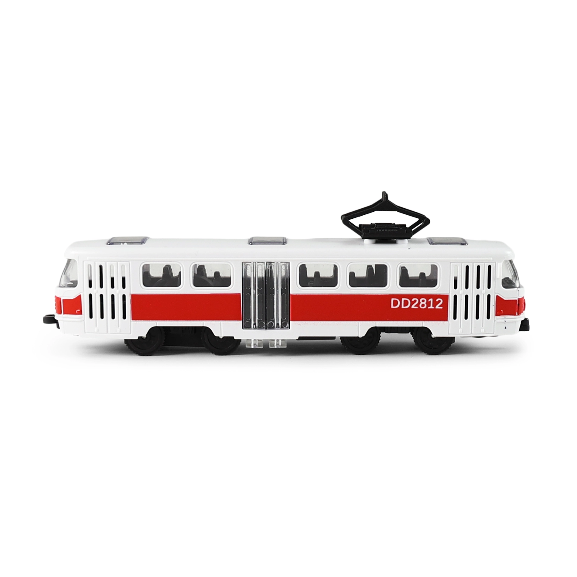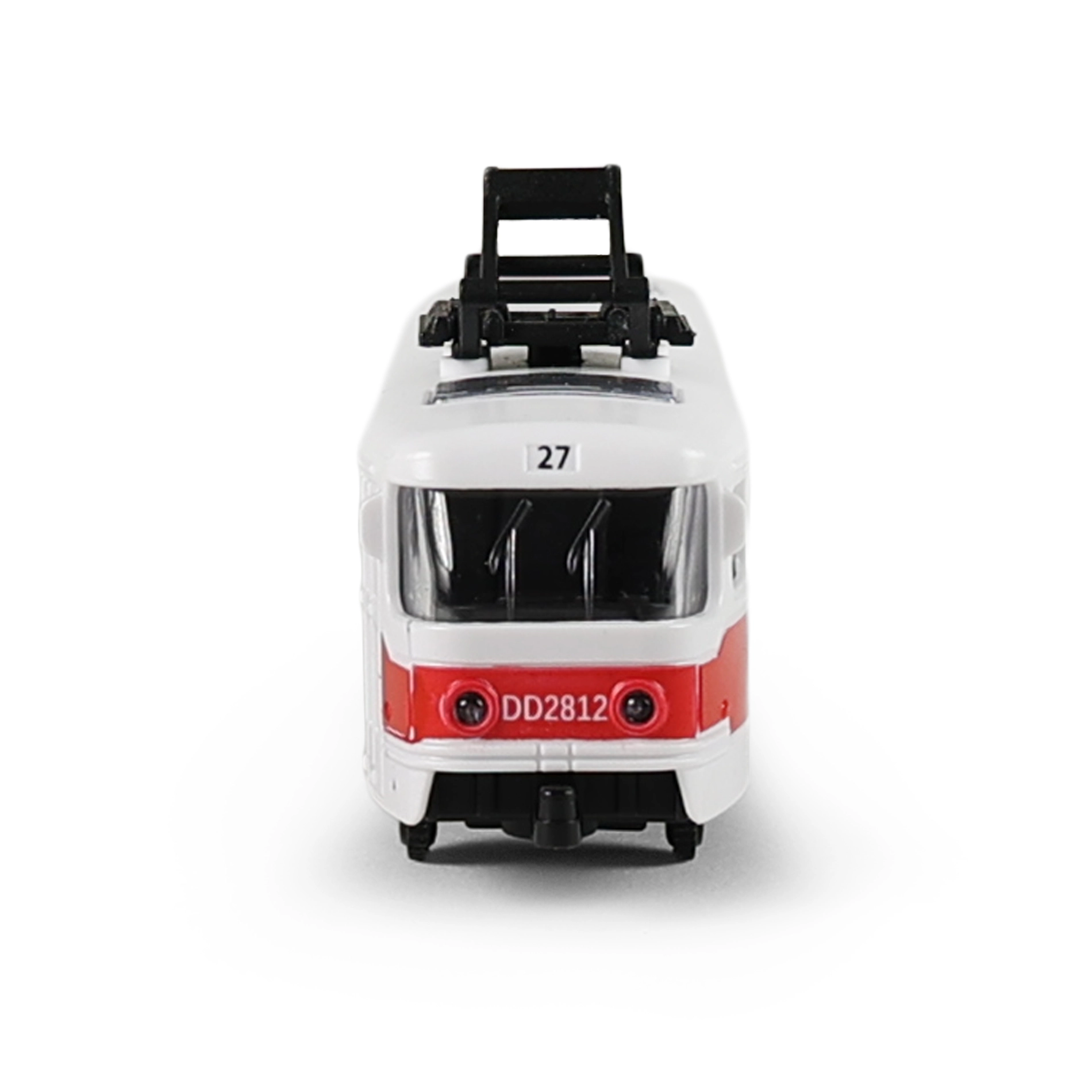 A realistic red-and-white tram with detailed windows, doors, and a roof collector is a great addition to any child's vehicle fleet. Thanks to its compact 16 cm size, it fits comfortably in a child's hand and is ideal for play at home or on the go.