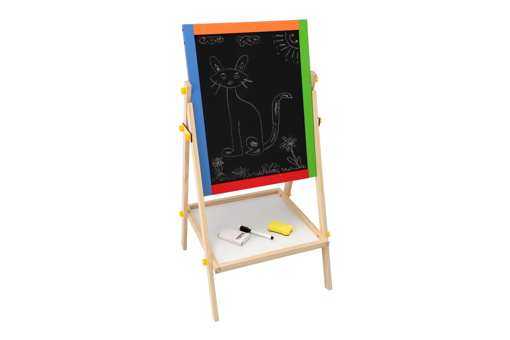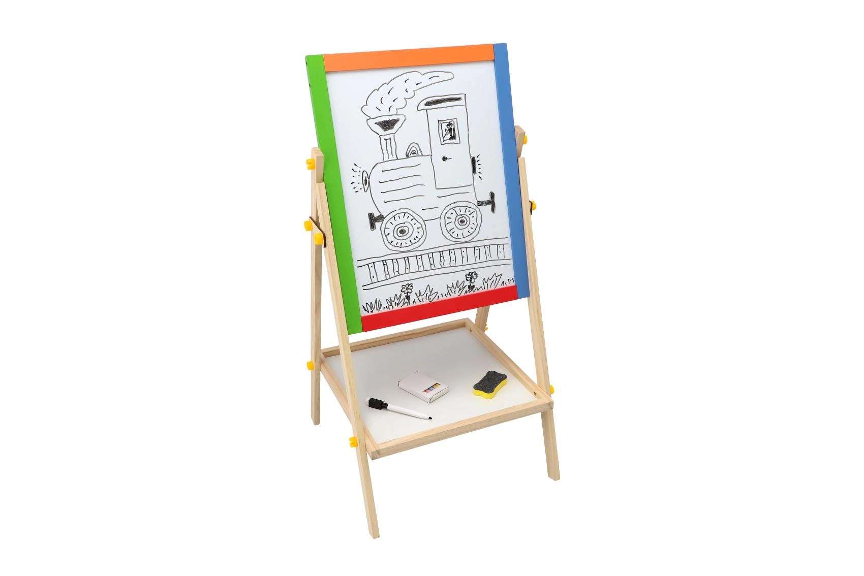 The integrated storage shelf holds chalk, a marker, and an eraser so everything stays organized and ready for creativity.