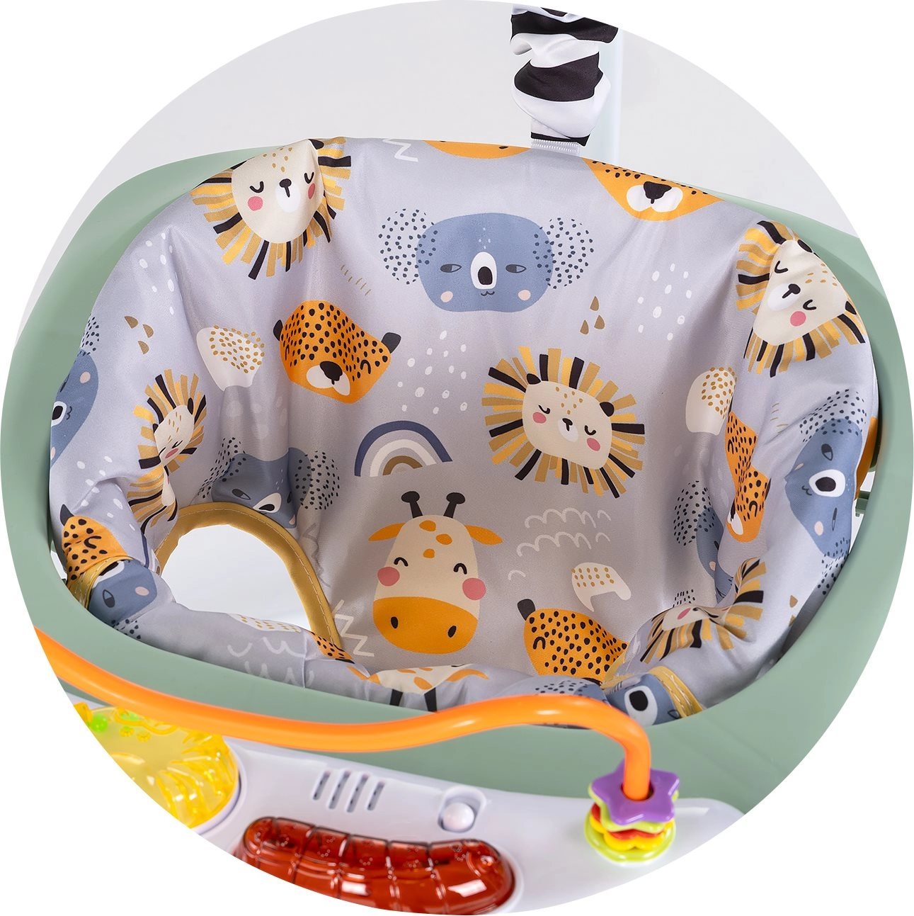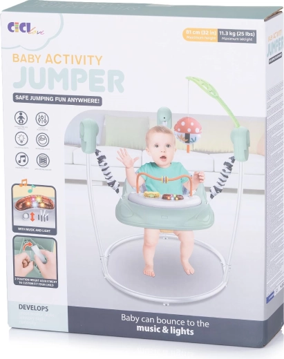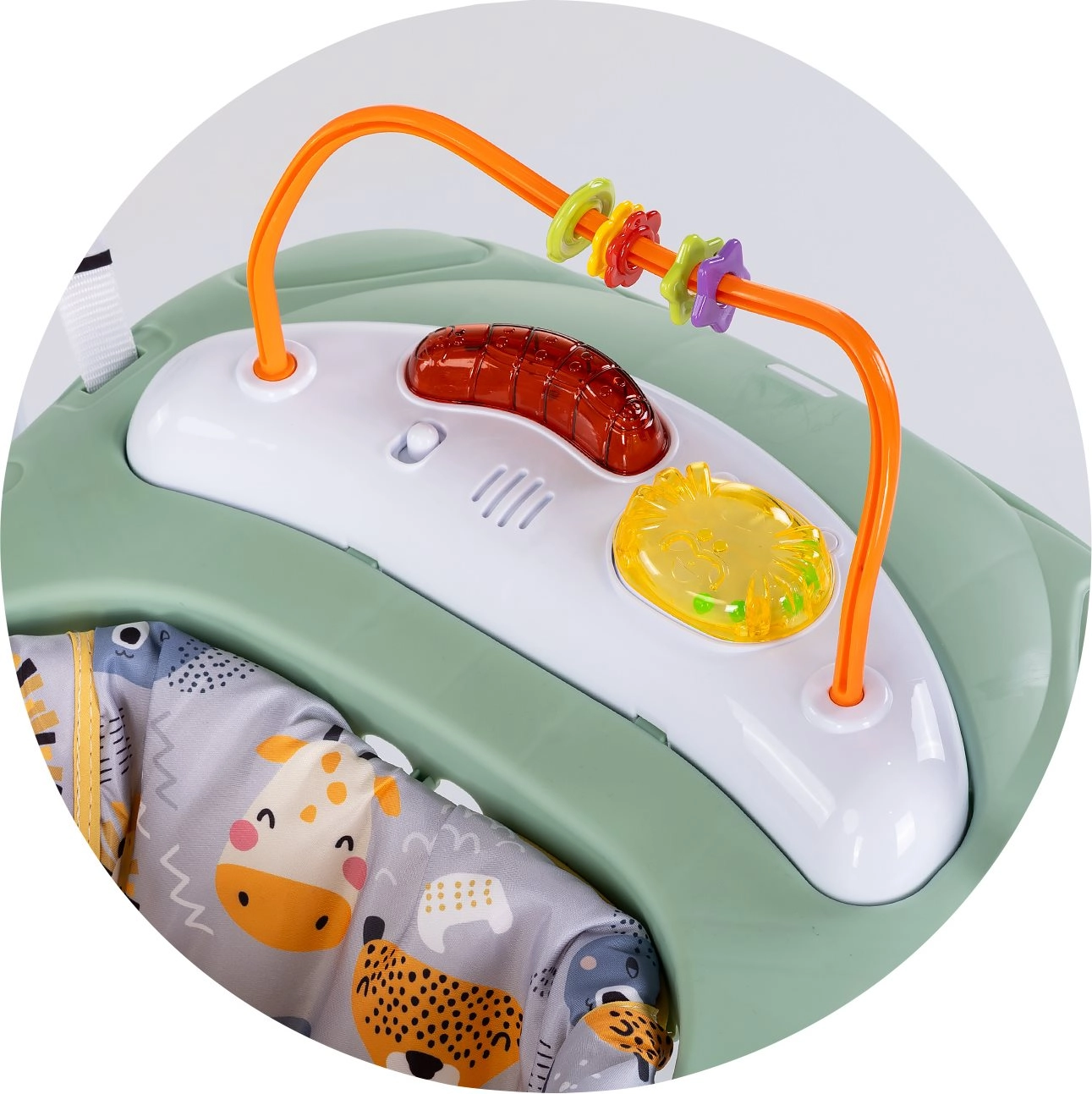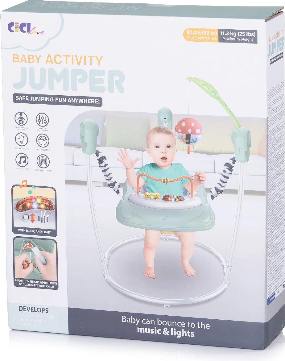 The Chipolino Jumpy Car mint jumper turns every playtime into joyful learning. Thanks to the soft, secure seat with 2 height positions, it perfectly adapts to your baby’s growth. The interactive panel with lights, music, and hanging toys supports motor skills, hand–eye coordination, and sensory development.