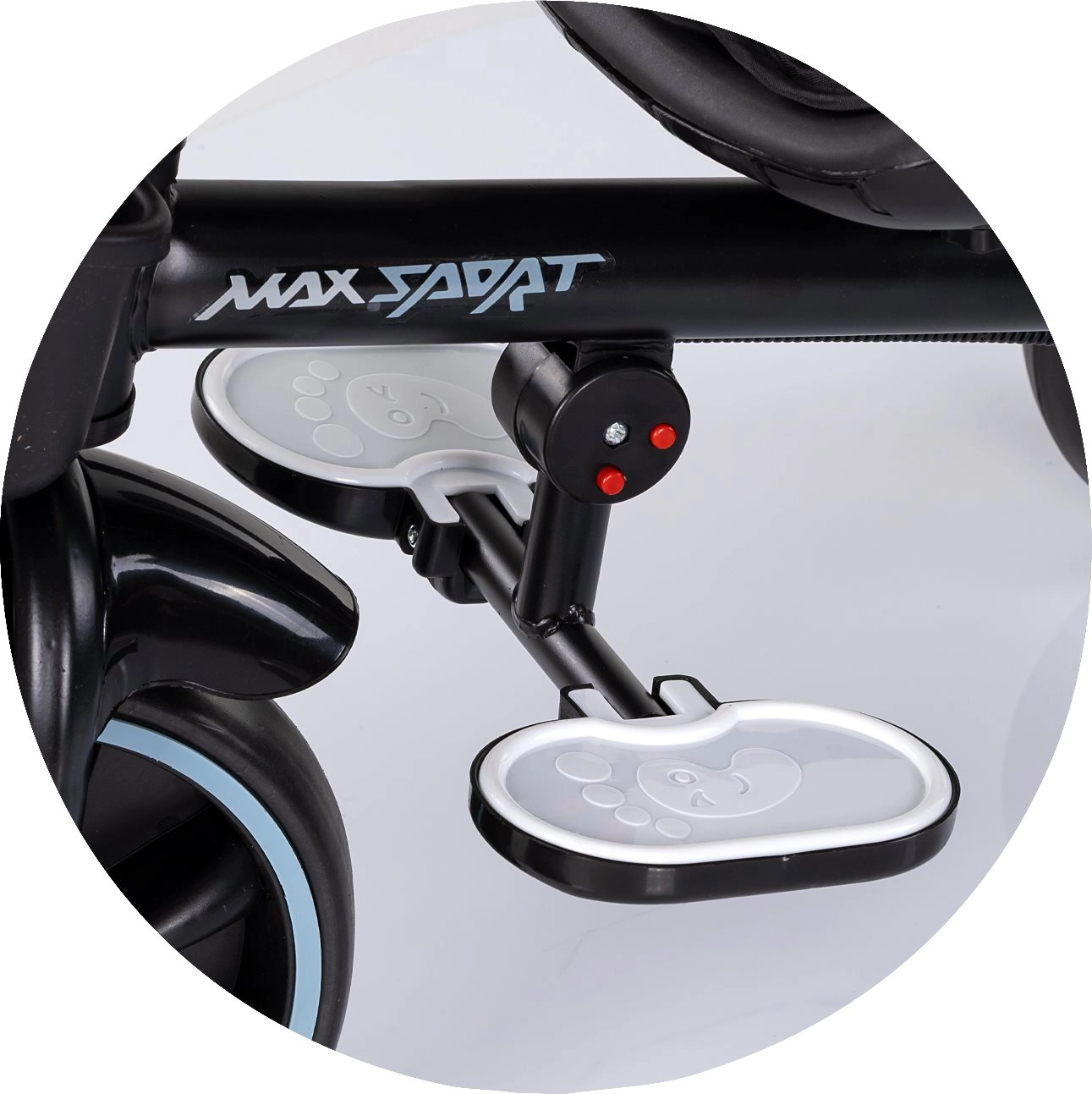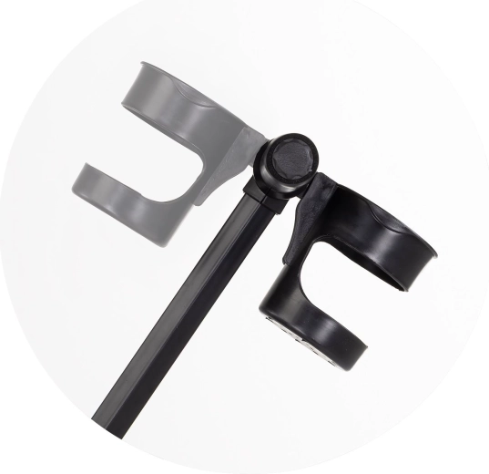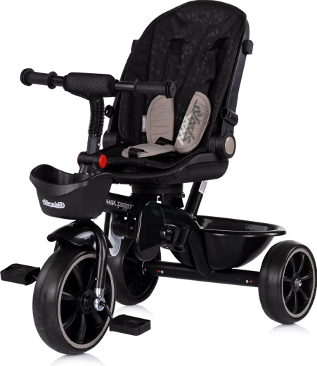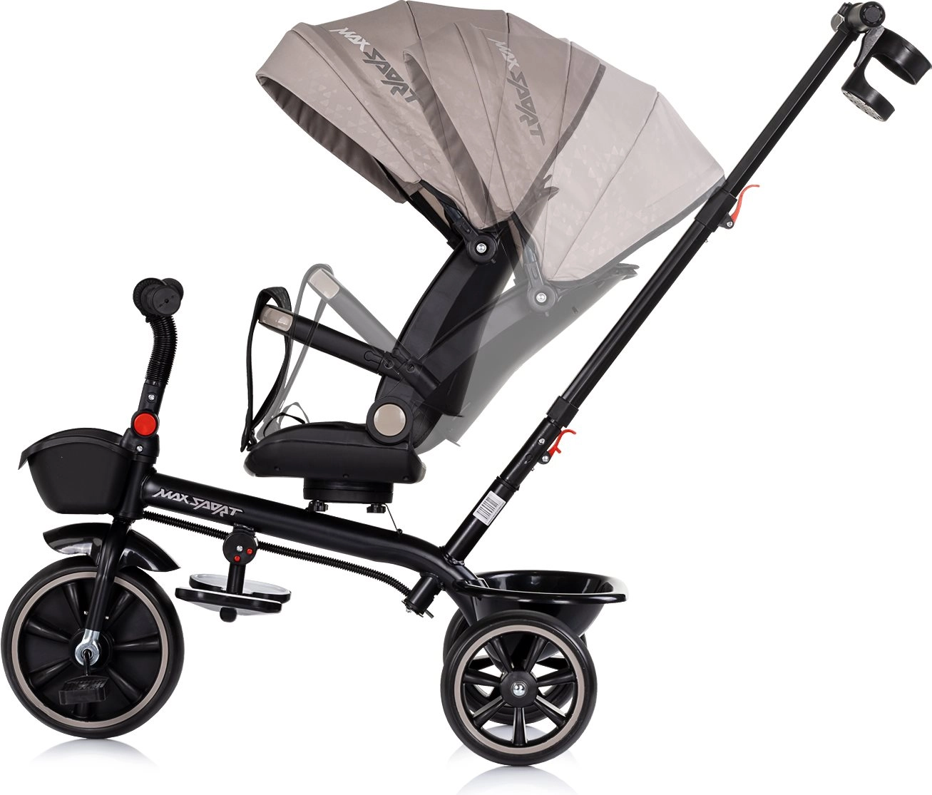 For maximum comfort, the tricycle includes soft textile padding, a safety harness, folding footrests, and spacious baskets at the front and back. The adjustable parent handle with two height settings allows confident guidance and direction control. The folding canopy with sun visor provides protection from the sun, and the cup holder can be mounted in two positions.
