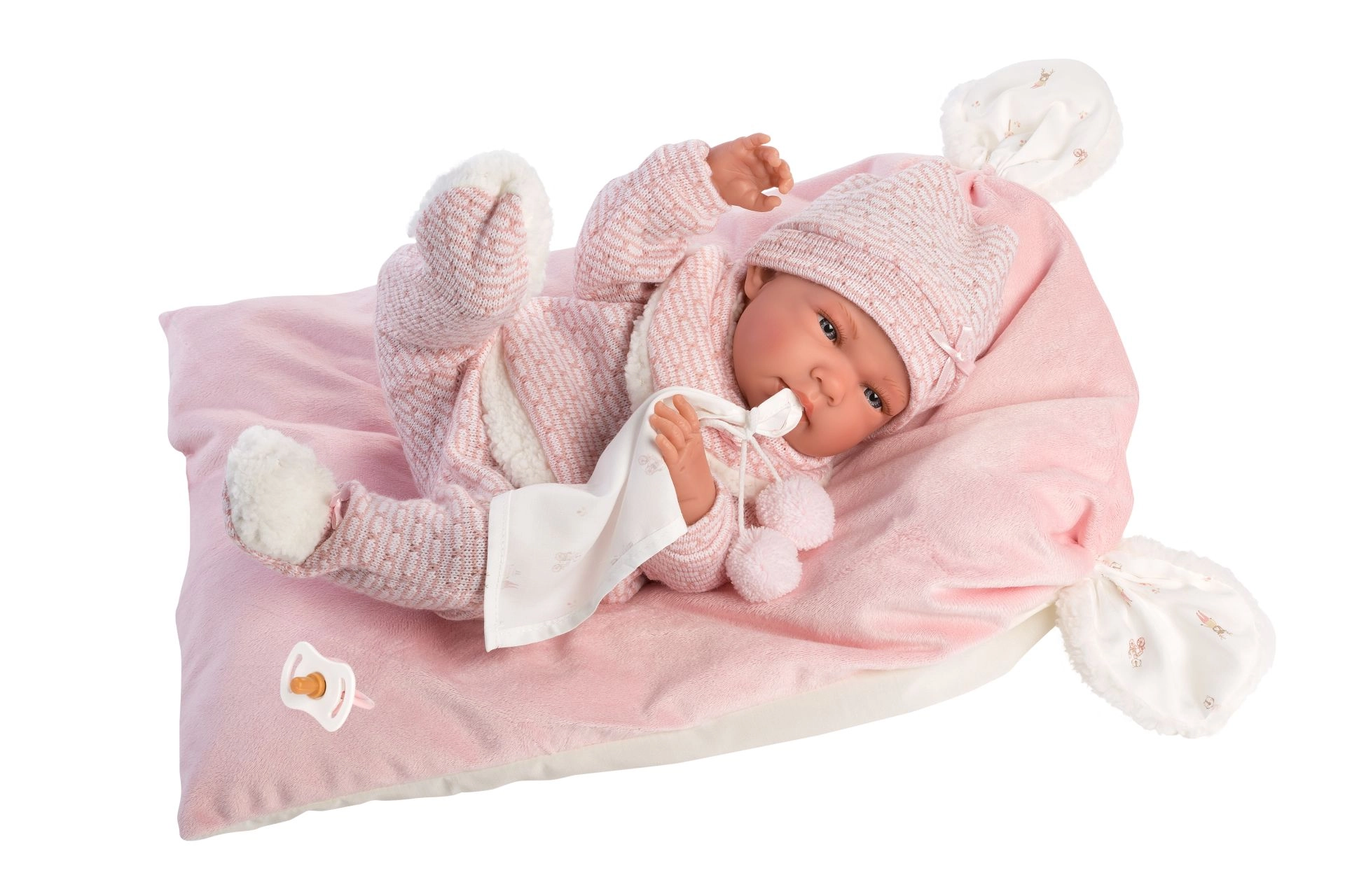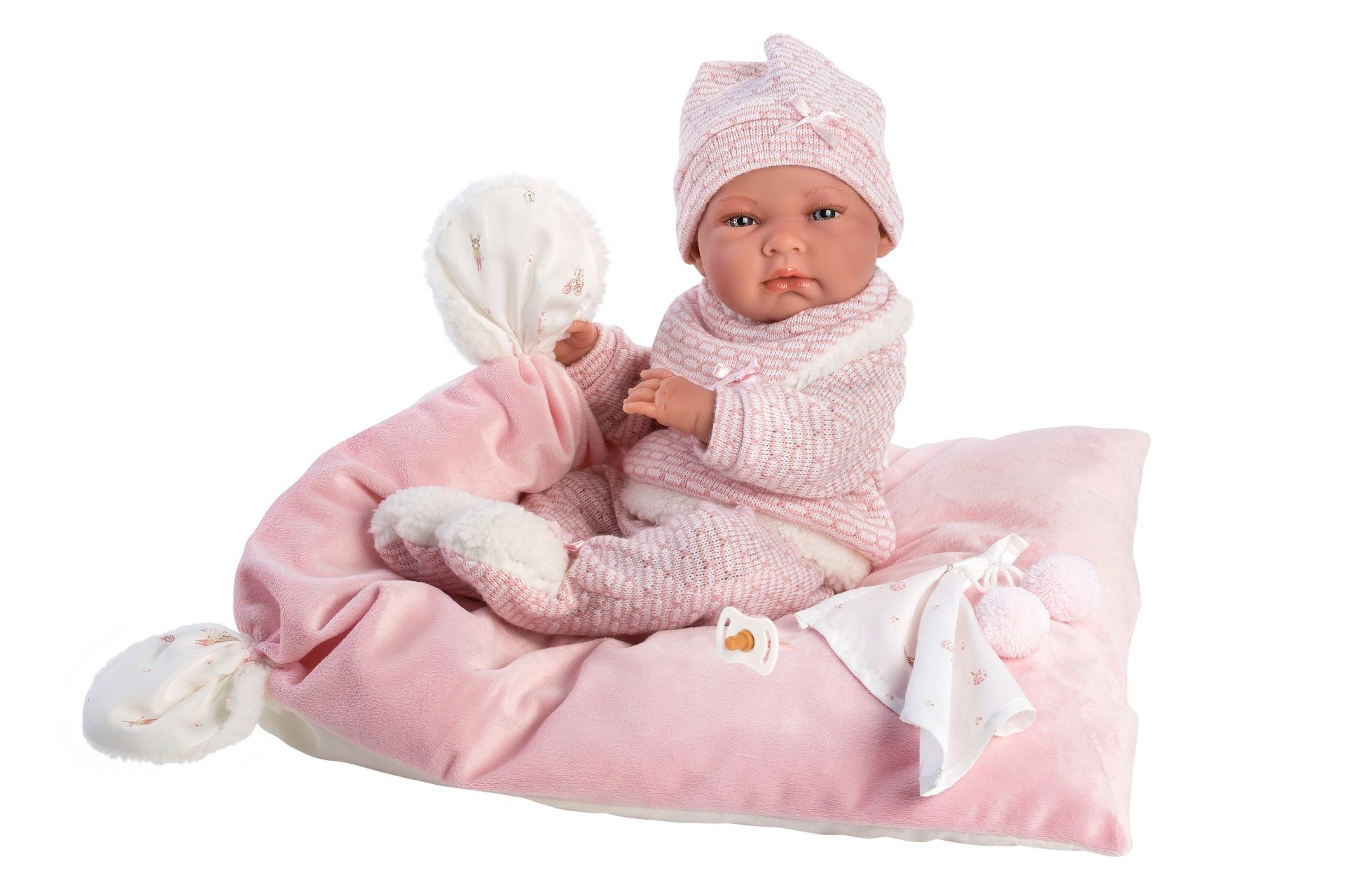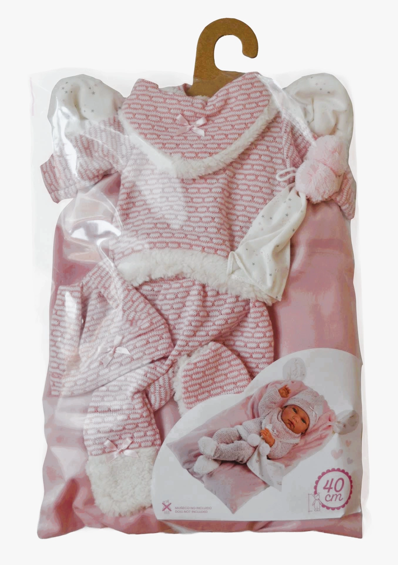 Adorable 5-piece outfit set for the NEW BORN doll by Llorens, sized 40–42 cm, including warm knitted pieces, a cuddly lovey with pompoms, and a super-soft pillow/mat. Handcrafted in Spain, perfect for care play and developing fine motor skills. Comes with a hanger for easy storage.