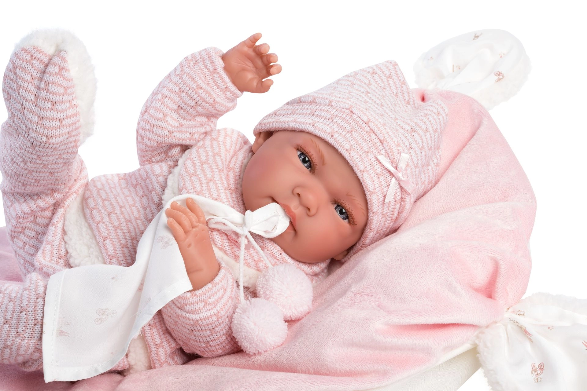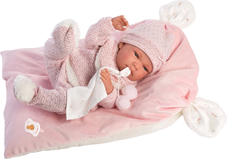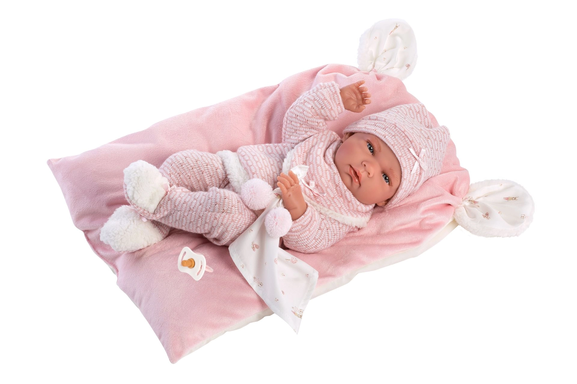 Adorable 5-piece outfit set for the NEW BORN doll by Llorens, sized 40–42 cm, including warm knitted pieces, a cuddly lovey with pompoms, and a super-soft pillow/mat. Handcrafted in Spain, perfect for care play and developing fine motor skills. Comes with a hanger for easy storage.
