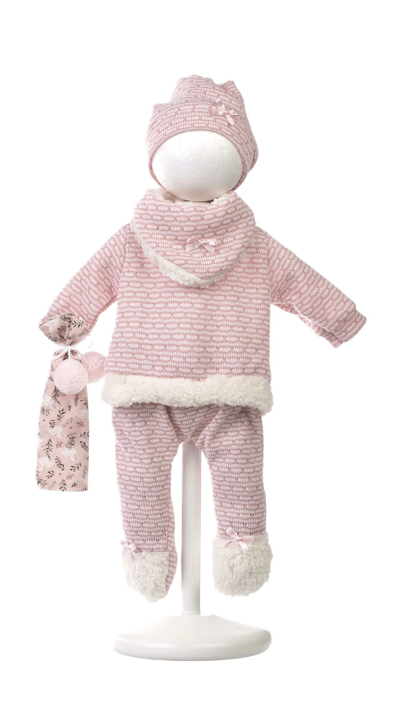 The set includes a cozy top, pants, hat, and booties with soft trims – ideal for winter doll dress-up and comfy playtime.