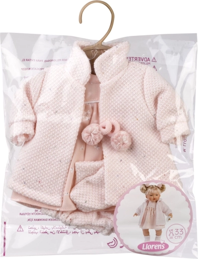 A stylish 4-piece outfit for a Llorens 33 cm doll delights with a soft pink design and quality craftsmanship. The set includes a dress, a knitted cardigan, socks/slippers, and decorative hair elastics for a perfectly coordinated look. Handcrafted in Spain for precise details and easy changing. Ideal for role-play caregiving and developing fine motor skills for children aged 3+.