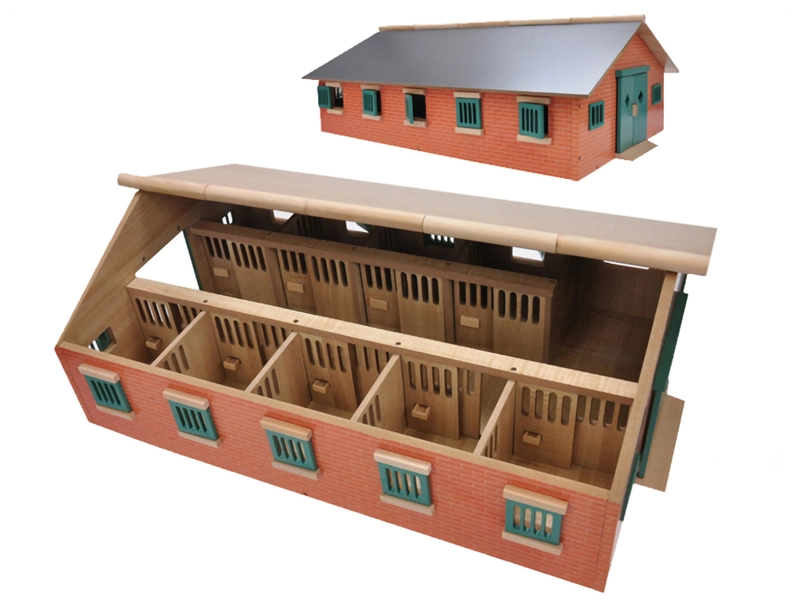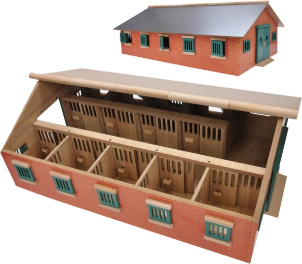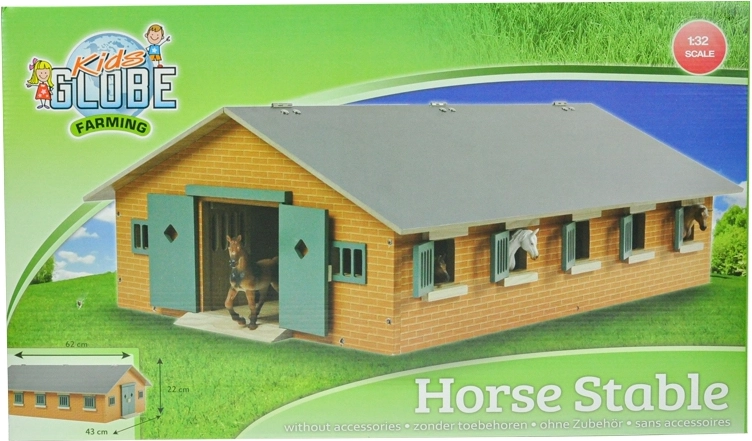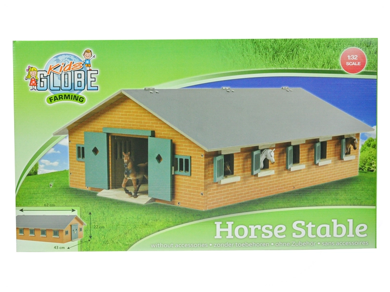 The KIDS GLOBE wooden stable is designed for figures and accessories in 1:32 scale. It offers realistic details and a sturdy construction made of quality wood, making it a great addition to any farm collection. Thanks to it, children will develop imagination, learn to care for horses, and keep order in their play stable.