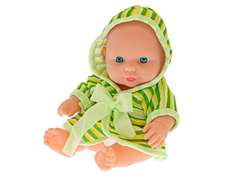 There are three attractive bathrobe colors available—blue, green, and pink—so kids can choose their favorite. Realistic facial details and movable limbs encourage creative and nurturing play at home or on the go.