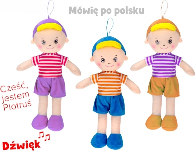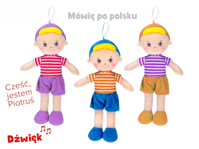 The super-soft Piotruś doll is an ideal first friend for the crib and on the go. Its gentle textile design invites cuddles and helps create a feeling of certainty and calm. Thanks to the interactive speaking and singing in Polish, your child naturally becomes familiar with the sounds and rhythm of the language and develops auditory perception.