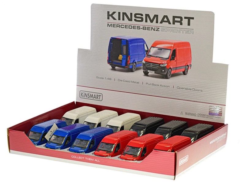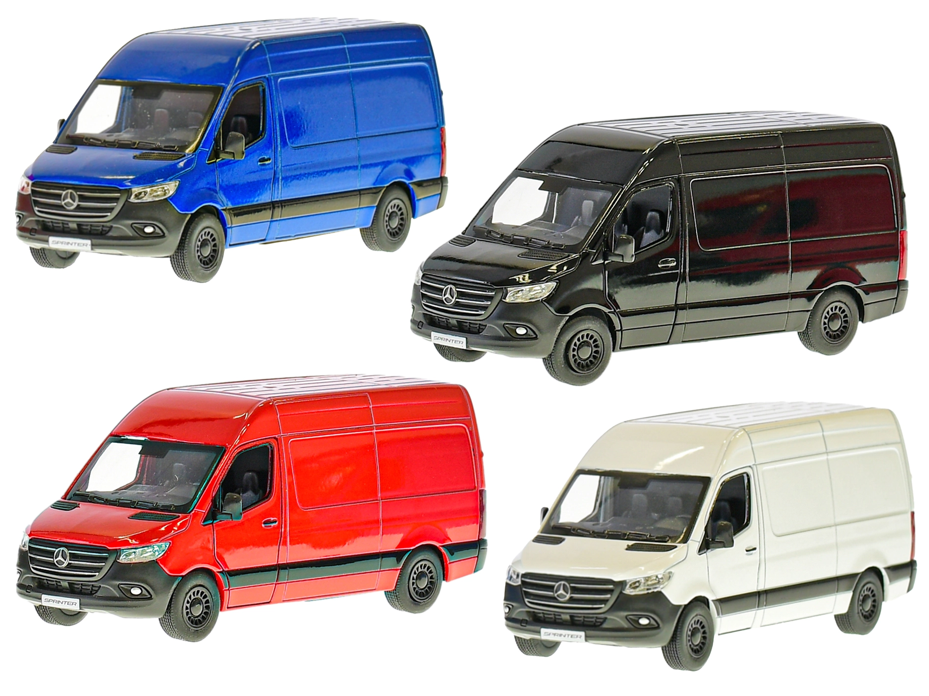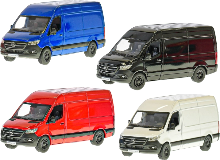 A detailed Mercedes-Benz Sprinter die-cast van model in 1:48 scale that will delight kids and collectors alike. It features opening doors, realistic proportions (12.5 × 5.5 × 5.5 cm), and a fun pull-back mechanism for forward motion. Available in 4 colors, made from a durable combination of metal and plastic, suitable for ages 3+.