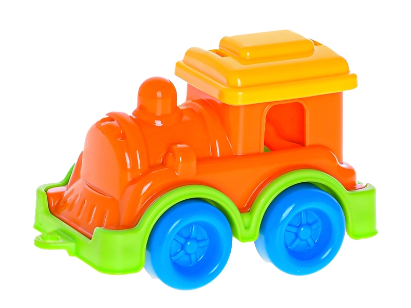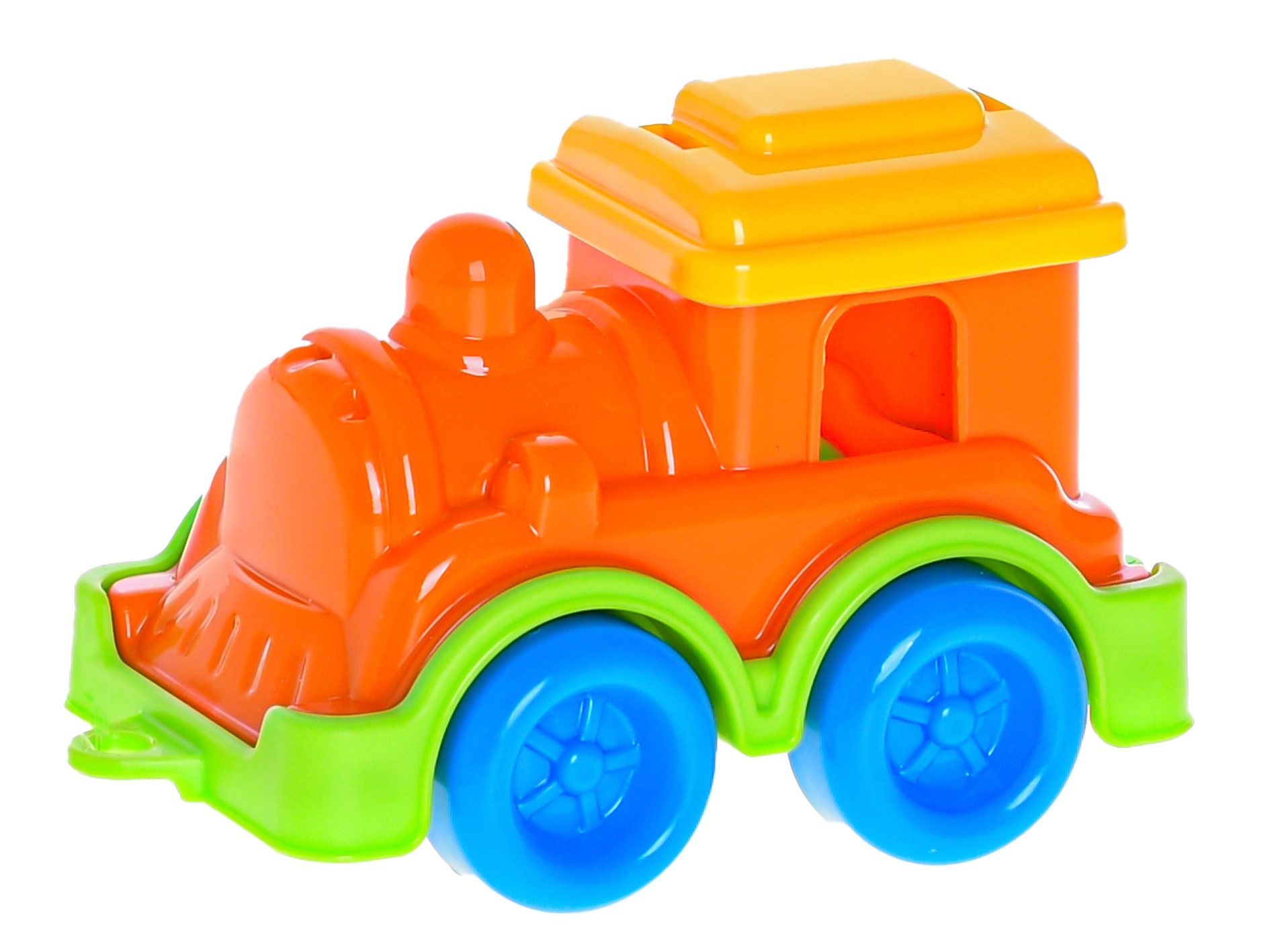 Discover a colorful plastic train with a freewheel that glides easily across flat surfaces and offers plenty of fun. Its robust yet lightweight design with smooth, rounded shapes is safe for small hands and fits comfortably in the palm.