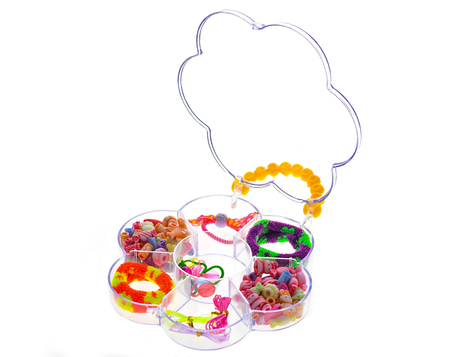 • 6 types of beads and accessories – a colorful selection of motifs for original hairstyles.