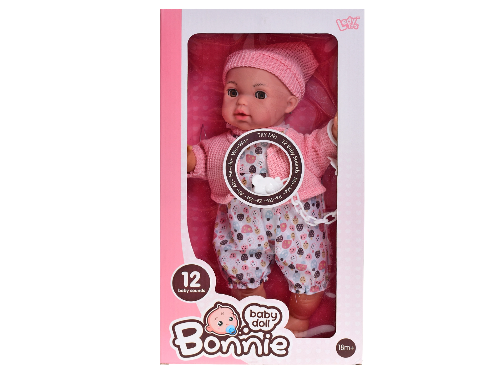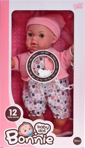 The doll is dressed in a beautiful pink outfit that can be easily put on and taken off. The package also includes a pacifier, enhancing the baby-care experience. Power is supplied by 3× AG13 batteries, which are already included, so kids can start playing right after unboxing.