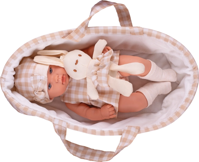 A cute 33 cm doll with a hard body and realistic details that will delight every little caregiver. She has open eyes, gently parted lips, and is coordinated in elegant beige tones. Includes a carrier and a plush bunny to encourage empathy and imagination. Delivered in a gift box, ideal as a present.