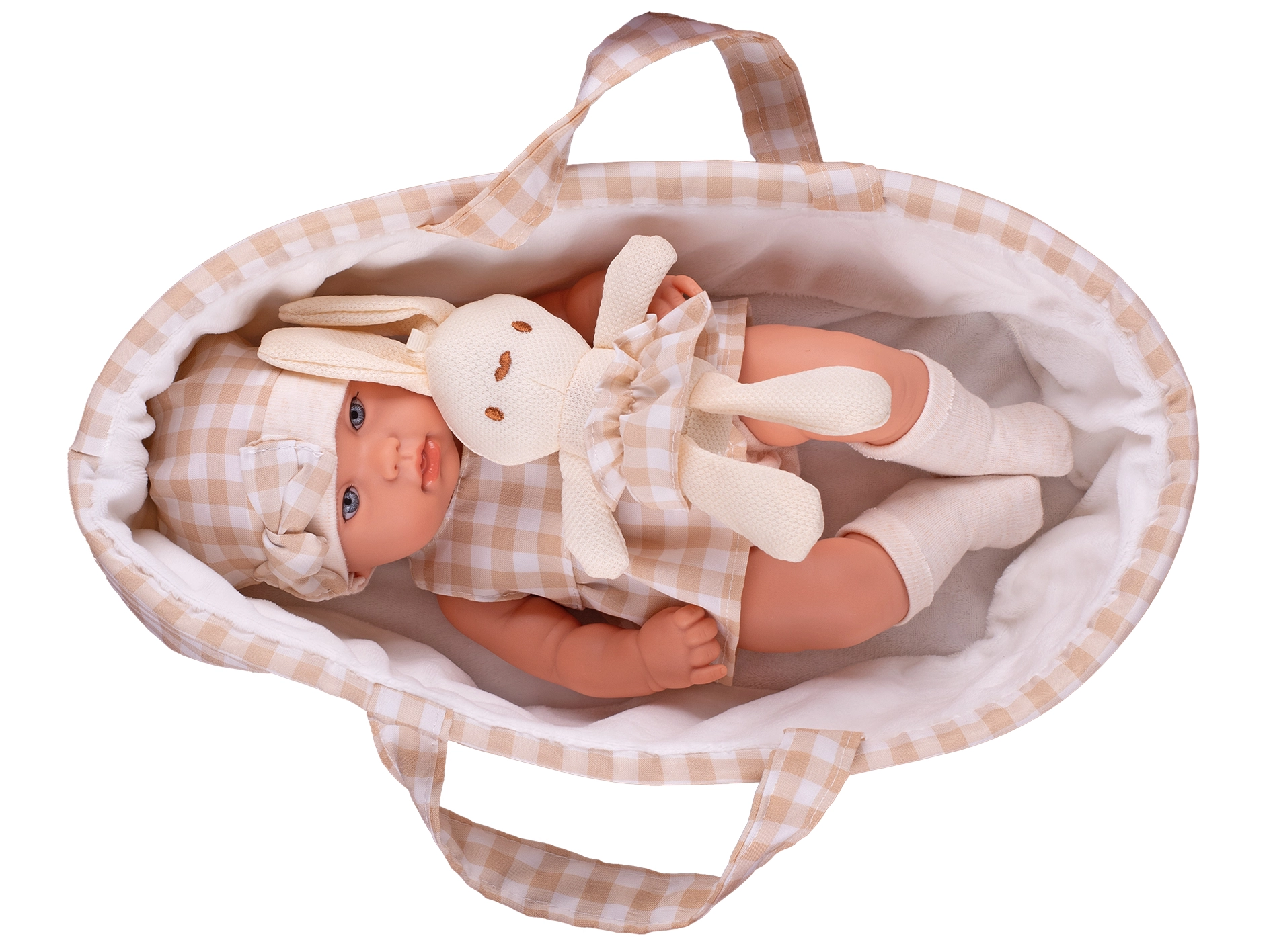 - Complete set: doll, carrier, and plush bunny in matching beige shades.