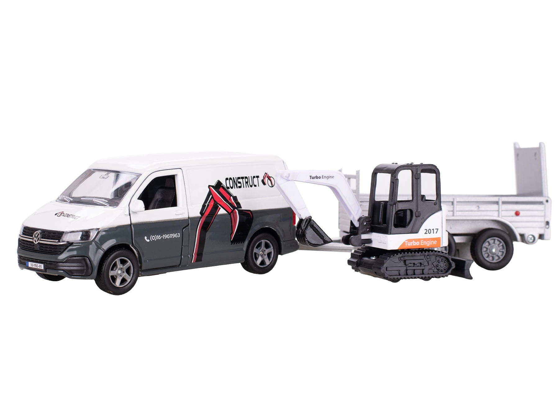 • Realistic set: VW Transporter, removable trailer, and functional mini excavator