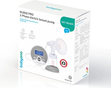 Professional electric breast pump BABYONO Nurse Pro for moms seeking reliability, comfort, and efficient expression. It offers 2 phases (stimulation and expression), 10 power levels, a clear LCD display, and dual power from mains or batteries. Certified medical device meeting hospital standards.
