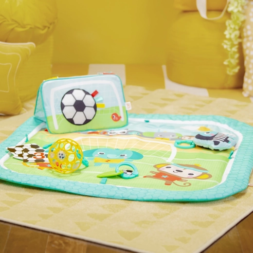 Includes 4+ removable toys: number and animal cards, a plush toucan with chime, textured leaf teether, and a classic easy-to-grip OBALL. Cheer on your little striker’s first “goals” every day.