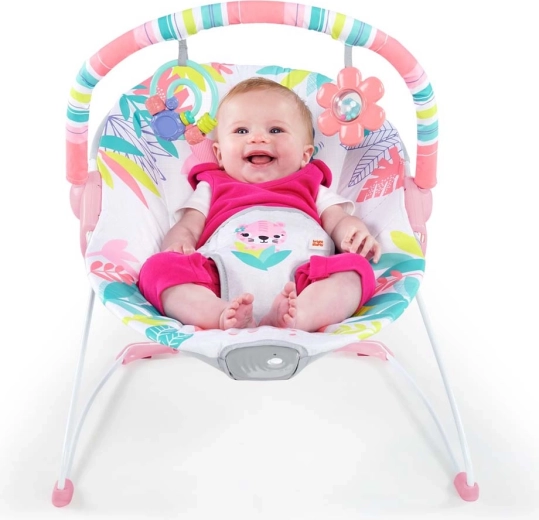The cheerful pink BRIGHT STARTS Flamingo Vibes bouncer brings your baby calm and fun in one. It offers soothing vibrations, a deep, soft seat with support, a removable toy bar with 2 toys, and secure positioning thanks to a 3-point harness and non-slip feet. The cover is easy to maintain – machine washable.