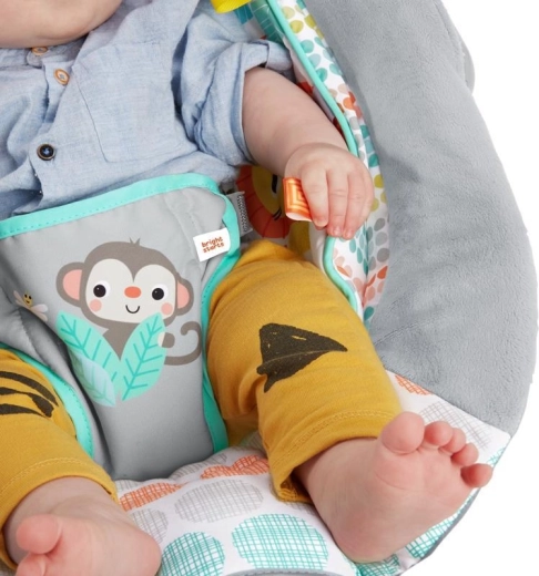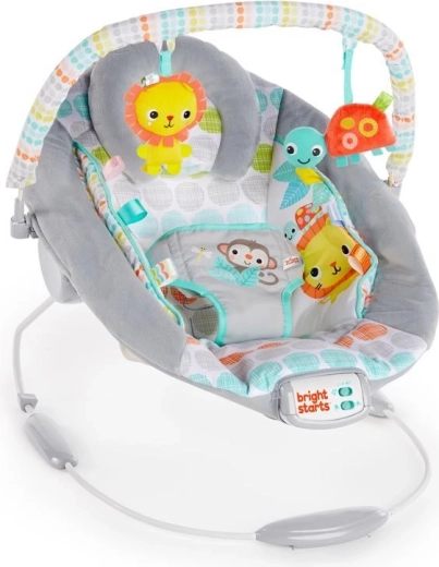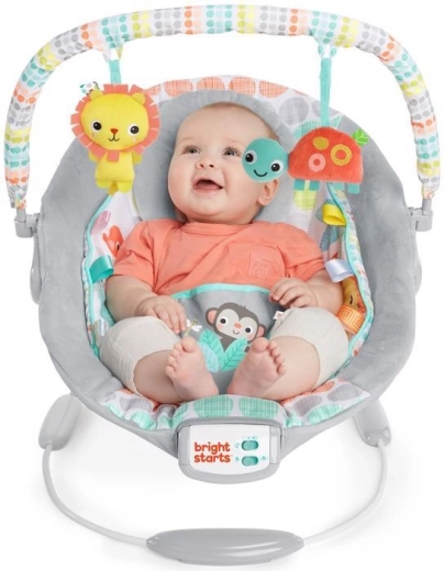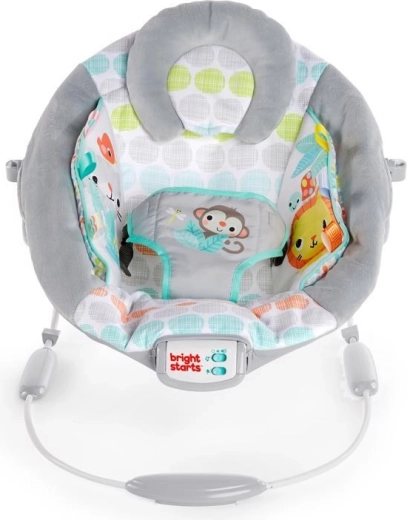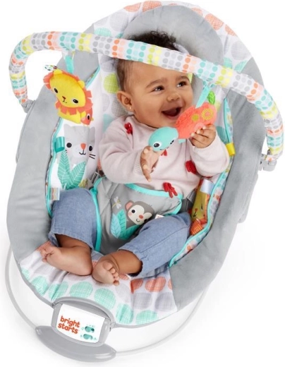 The Bright Starts Whimsical Wild bouncer is designed for everyday comfort and fun. Soft padding, a removable headrest, and an integrated newborn insert provide proper support for your little one. Soothing vibrations and 7 melodies with adjustable volume help calm and lull to sleep, while the 15-minute timer saves battery life.