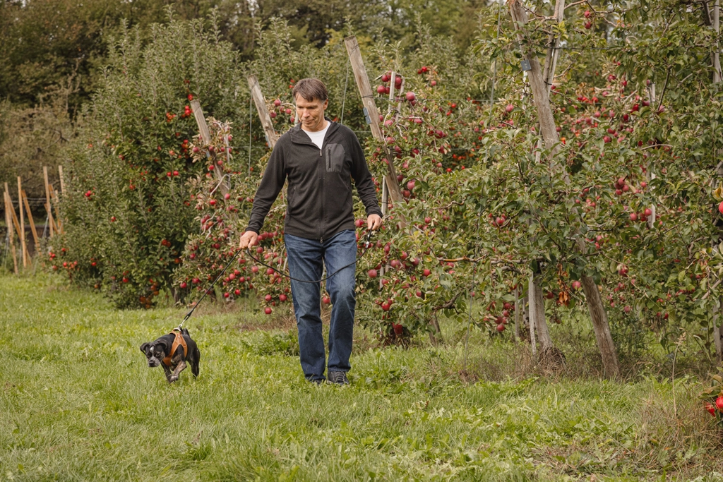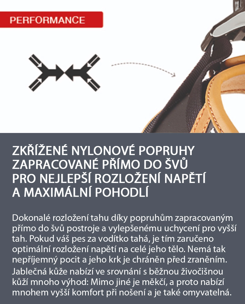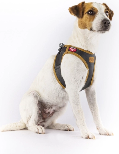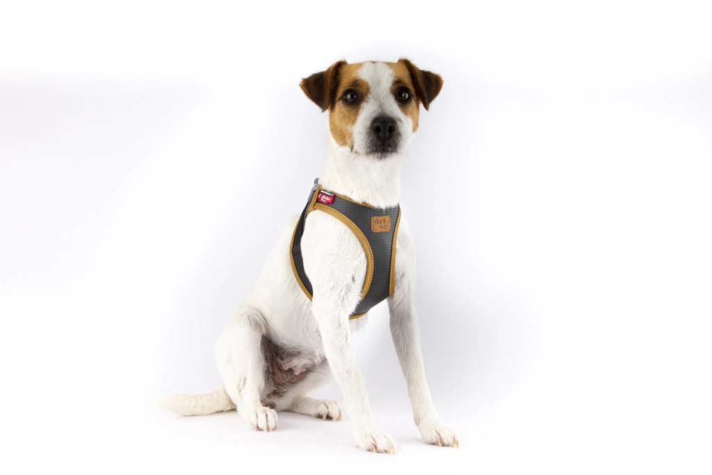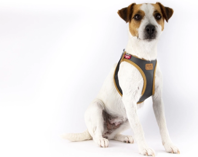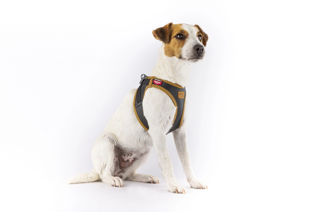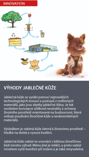 Discover the innovative harness made from apple leather, produced from by-products of apple juice production. This premium, plant-based material is softer than conventional leather, pleasant to the touch, abrasion-resistant, and easy to wipe clean. The perforated construction ensures excellent breathability and comfort for everyday walks.