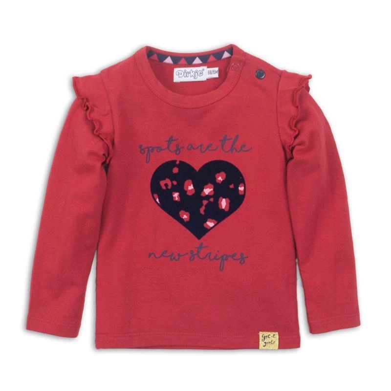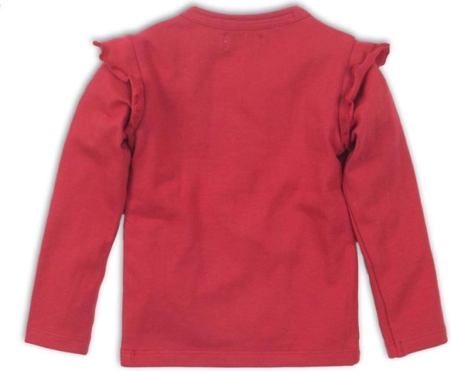 A cute girls’ long-sleeve T-shirt from DIRKJE in a rich red color delights with its comfortable fit and soft fabric. The style is complemented by delicate ruffles on the sleeves and a sweet heart applique. Thanks to the pleasant composition with elastane, the T-shirt adapts beautifully and is ideal for everyday wear.