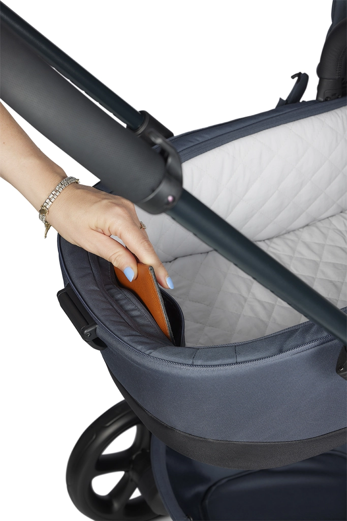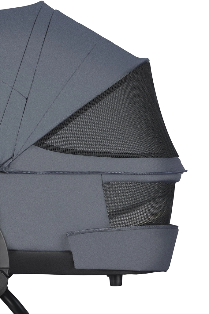The carrycot is lined with soft organic cotton and offers an anti-reflux system and improved ventilation. The extendable canopy and zip-up apron keep warmth in and wind out.