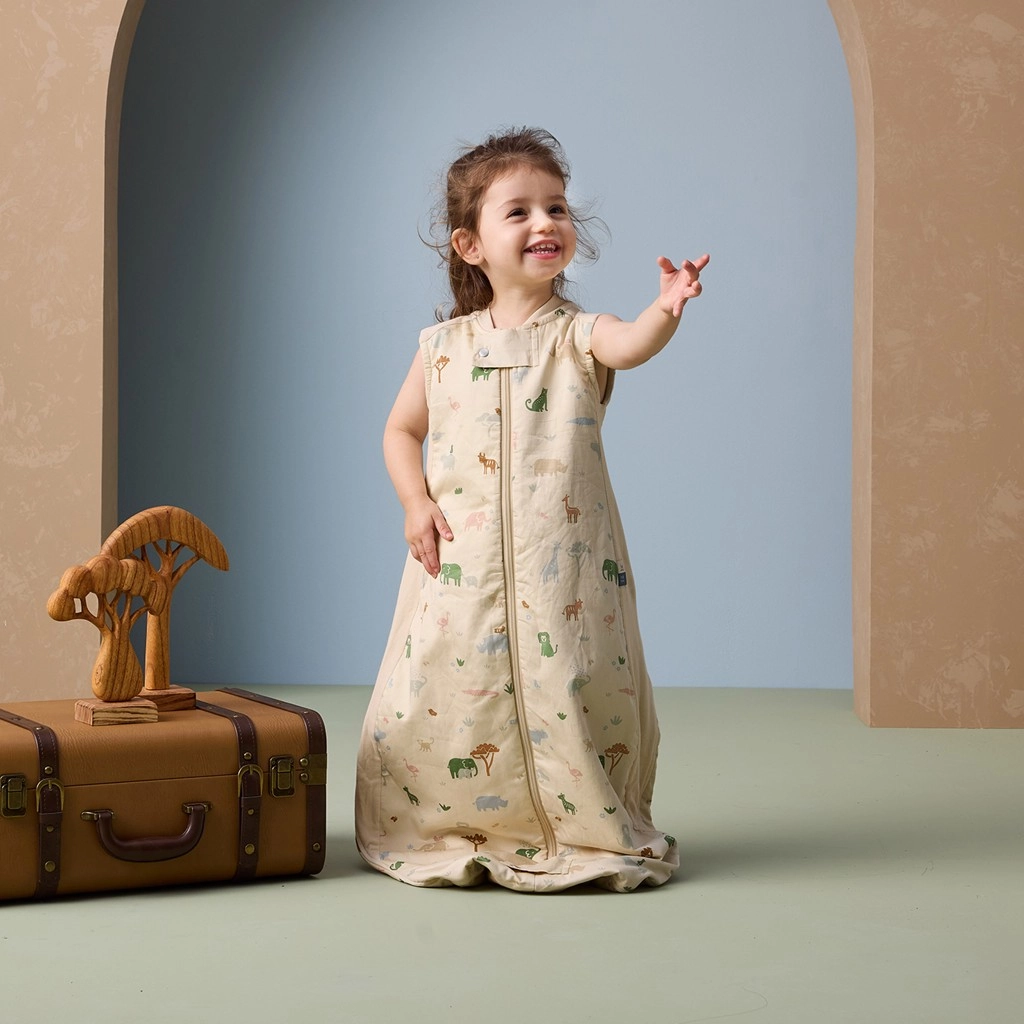 Keep your baby comfortable and safe with the ErgoPouch Sheeting Savannah sleeping bag rated at 1 TOG, ideal for rooms at 21–24 °C. Made from GOTS organic cotton with a luxurious 400 thread count, it offers breathability, gentleness on skin, and an ergonomic cut with stretch side panels for free movement. The two-way zipper makes nighttime diaper changes easy, and the bell-shaped design supports healthy hip development without the need for additional blankets.