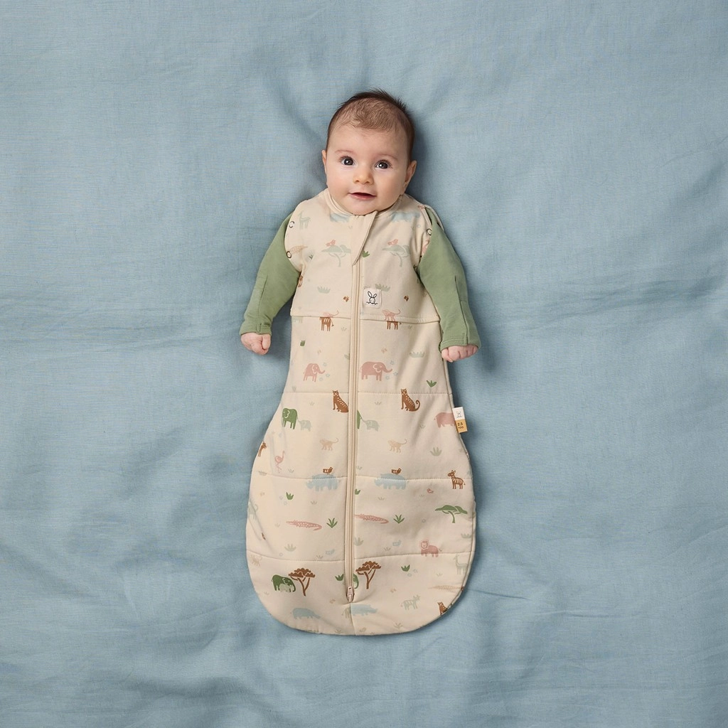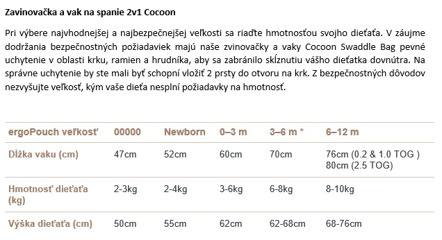 The ergonomic 2-in-1 ergoPouch Cocoon swaddle and sleeping bag helps your baby sleep peacefully without loose blankets. The thermal rating of 2.5 TOG is ideal for room temperatures of about 17–23 °C. The chest section is approximately 1.0 TOG to prevent overheating and allow easy breathing. The soft GOTS organic cotton with a bamboo lining is gentle even on sensitive and eczema-prone skin.
