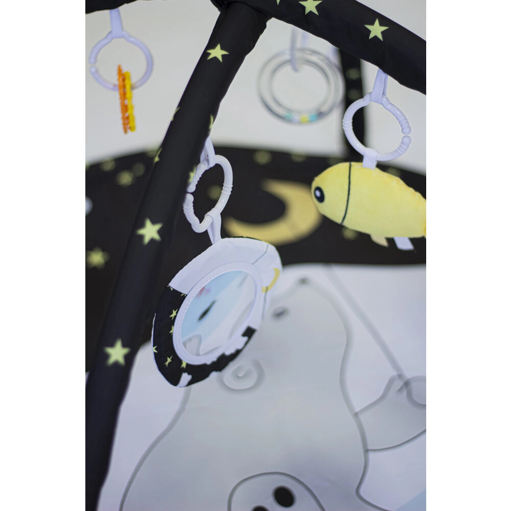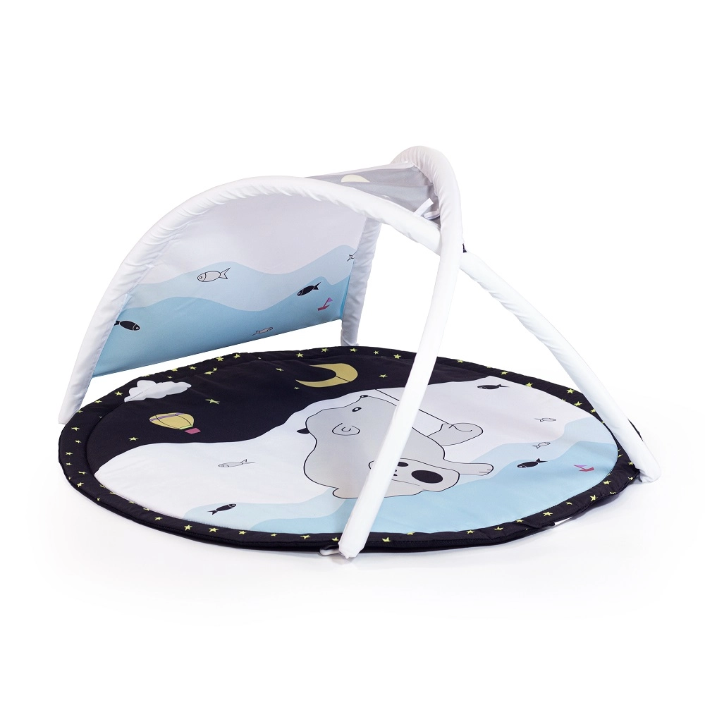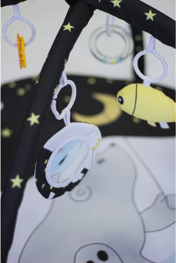 With two removable arches and four hanging toys on C-rings, your child practices grasping, hand–eye coordination, and motor skills. The flexible construction allows three modes of use: a classic mat with an arch, a shaded mat, and a teepee tent for imaginative play.