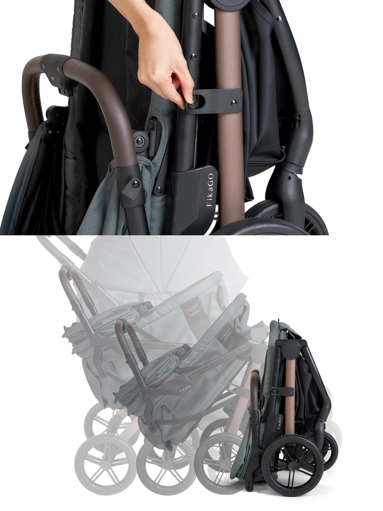 Easy handling and compact storage are highlighted by one-hand automatic folding with an auto-lock. The stroller stands on its own when folded, saving space at home and in the car. The ergonomic leather handle feels pleasant to the touch and makes maneuvering easier. With 360° swiveling front wheels and full suspension, the ride is smooth on city sidewalks and park paths alike.