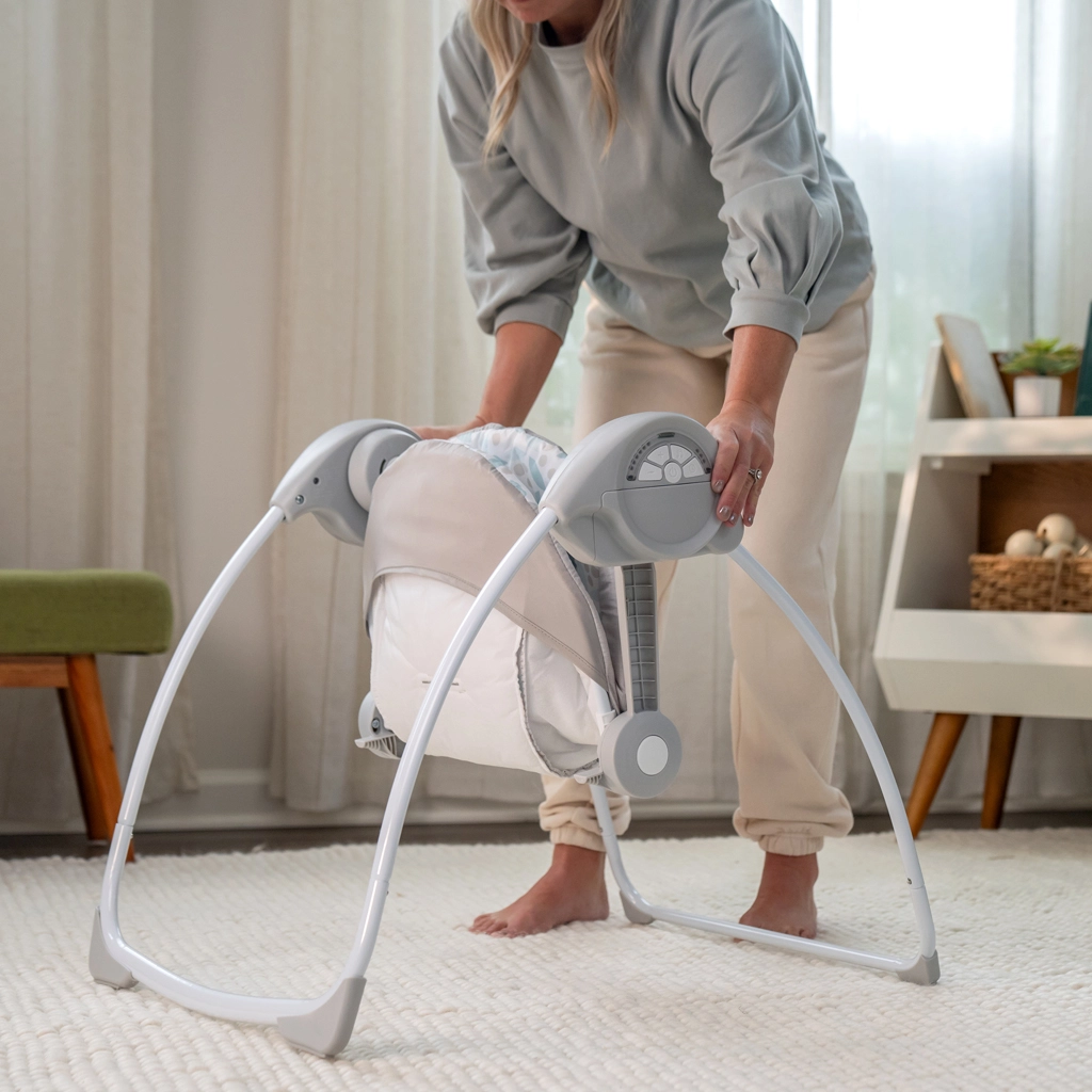 A practical, portable swing for newborns up to 9 kg delivers gentle, soothing motion, pleasant music, and engaging toys for visual and auditory stimulation. WhisperQuiet™ technology ensures quiet operation, so nothing disturbs sleep or downtime. With its compact foldable design, you can take it anywhere—grandparents’ house, cottage, or a small apartment.