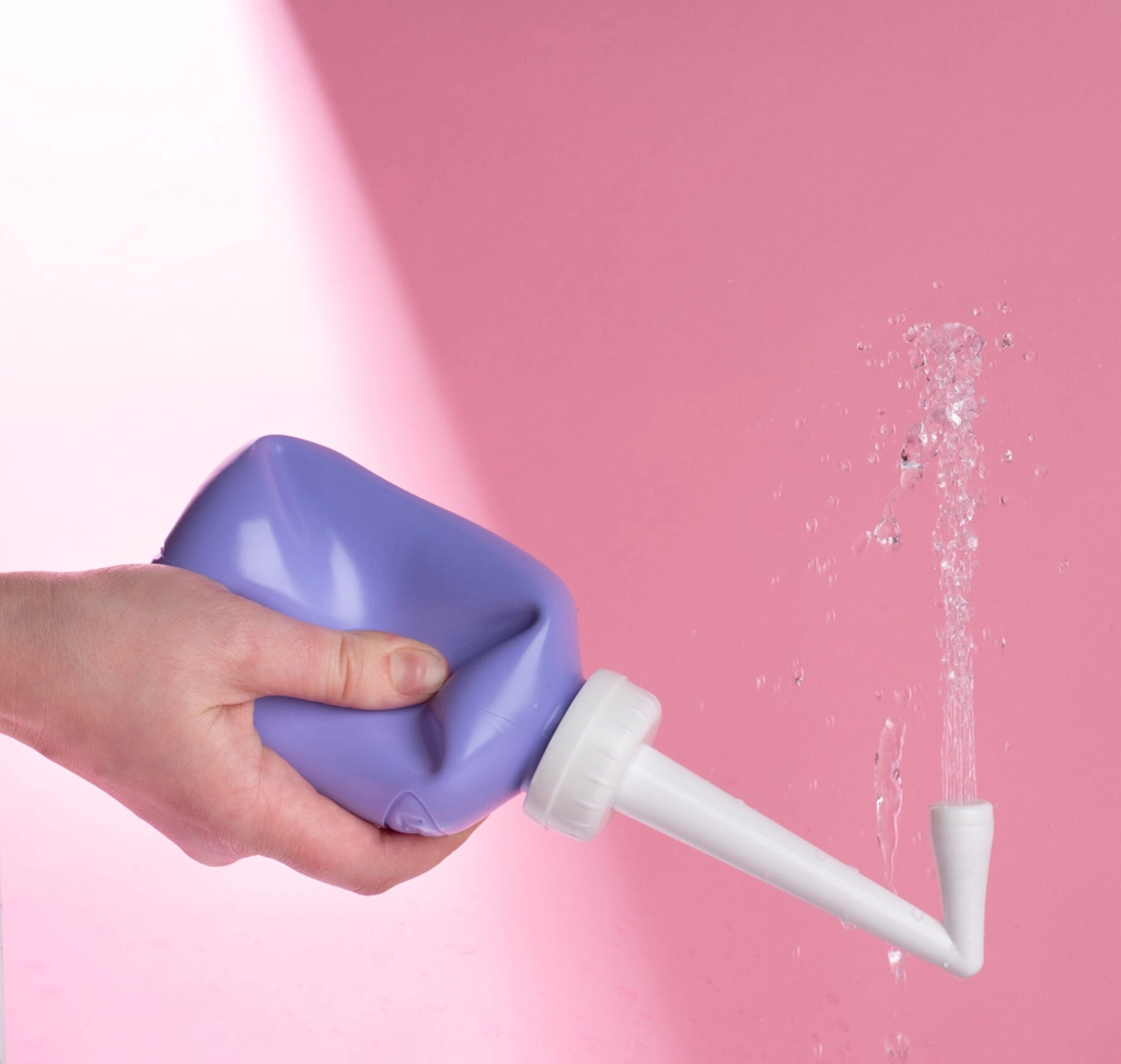 - On the toilet, point the tip toward the perineal area; can be used during urination to dilute urine