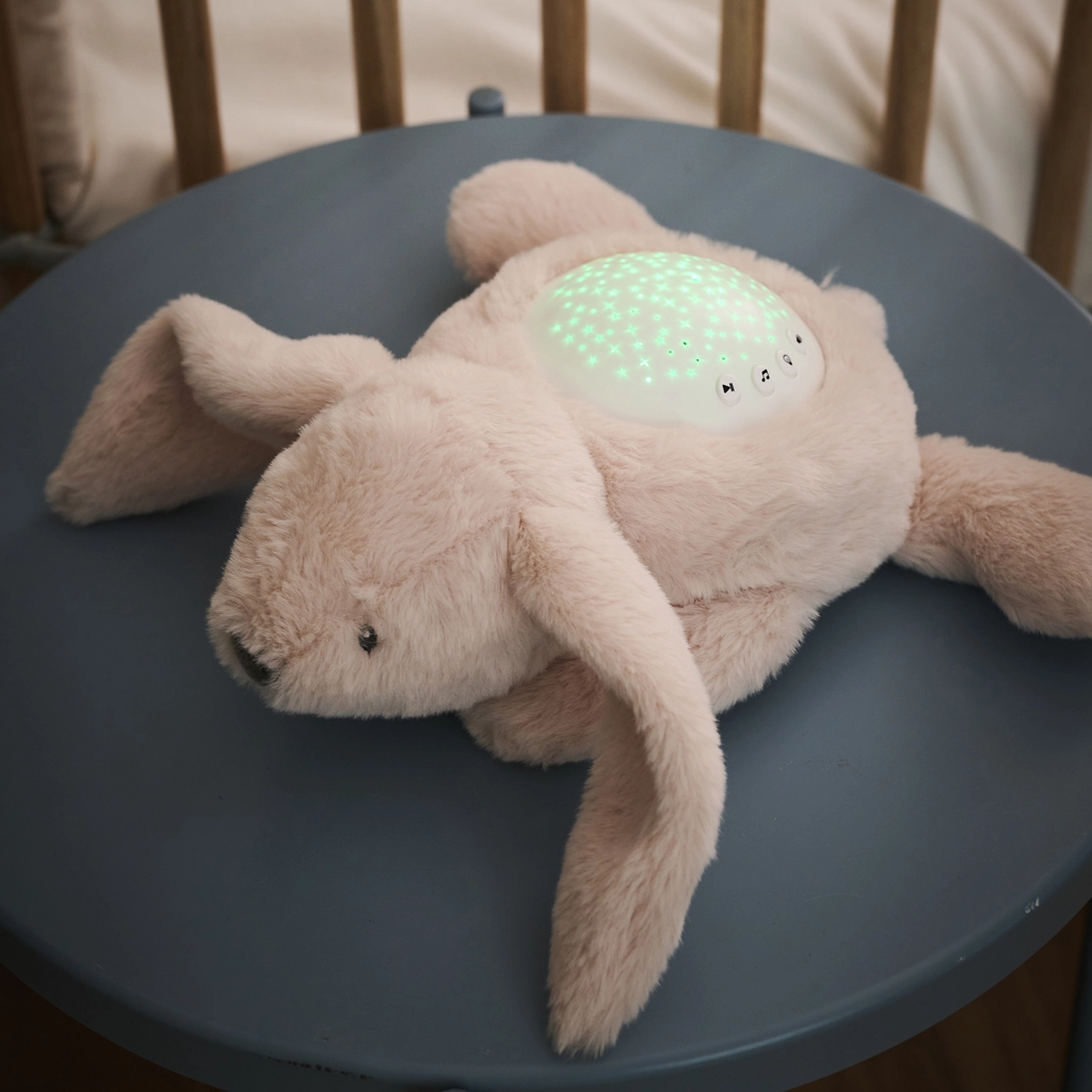 A cute plush bunny with an integrated projector and music module turns the nursery into a calm sleep oasis. It offers starry-sky projection in different colors, soothing lullabies and white noises (rain, waves, heartbeat), and safe LED lights that do not heat up. Thanks to the 20-minute timer and adjustable volume, it helps babies fall asleep easily and gives parents peace of mind.