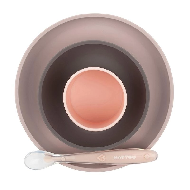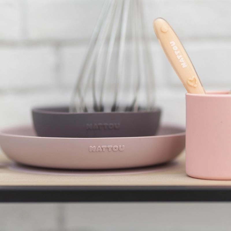 Discover comfortable and safe mealtimes with the Nattou kids’ set. The soft, flexible 100% silicone feels pleasant, won’t break, and thanks to the non‑slip suction bases on the bowl and plate it stays firmly in place on a clean tabletop or highchair tray. Ideal from first purees (4+ months) through self‑feeding for children aged 12–36 months.