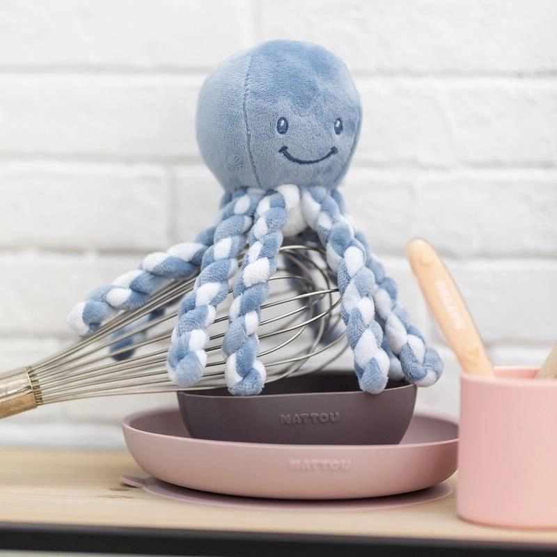 A practical four-piece dining set made of soft silicone from Nattou makes first purees and self-feeding easier. It includes a plate and bowl with a suction base to prevent slipping, a cup, and a soft, gum-friendly spoon. Thanks to the rounded inner edges, food is easy to scoop. The silicone is durable, unbreakable and BPA‑free, dishwasher‑safe and ideal for everyday use.