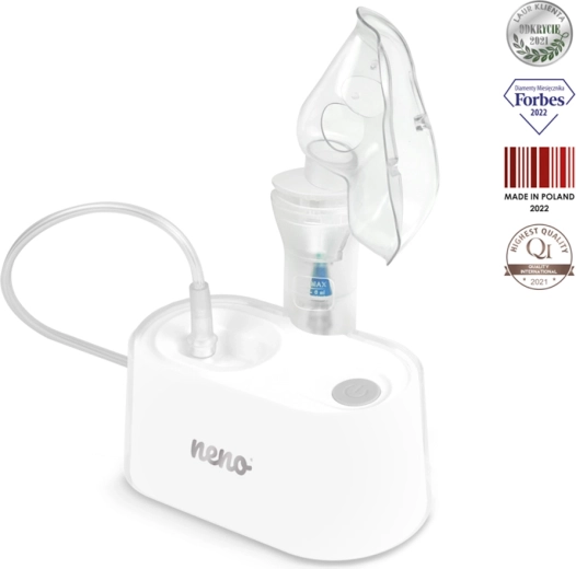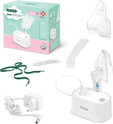 Enjoy daily relief when breathing with the compact compressor inhaler Neno Sano. It offers high nebulization efficiency, quiet operation at 52 dB, two masks for children and adults, and simple one-button control. Thanks to the long 150 cm tube, stable base with 5 feet, and a large 8 ml medication cup, it is ideal for home inhalation during colds, runny nose, sinus inflammation, and asthma.