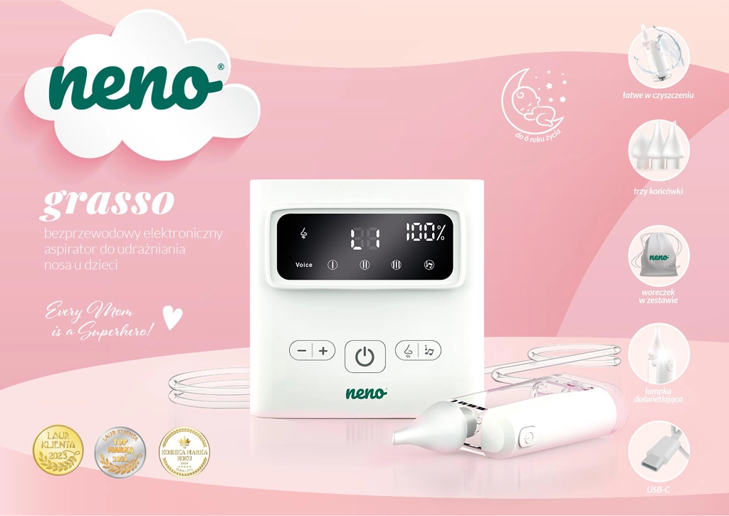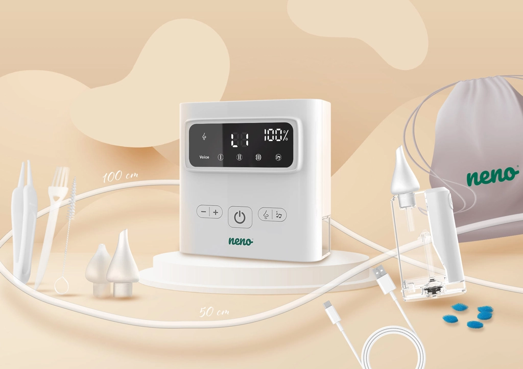 Thanks to wireless operation, USB‑C charging, and compact dimensions, Neno Grasso is perfect for travel. The box includes complete accessories, including a protective case, tubes, filters, and cleaning tools—everything you need for safe and comfortable use from birth up to 6 years.