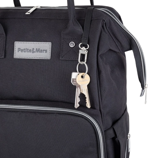The thoughtful layout offers 11 easy-access pockets, including 2 thermal pockets to maintain bottle temperature, a waterproof pocket for wet clothes or wipes, an external bottle pocket, and an external pocket for wet wipes. You also get a key leash, a rear zip entry for quick access, and a strap to slide over a suitcase handle for travel.