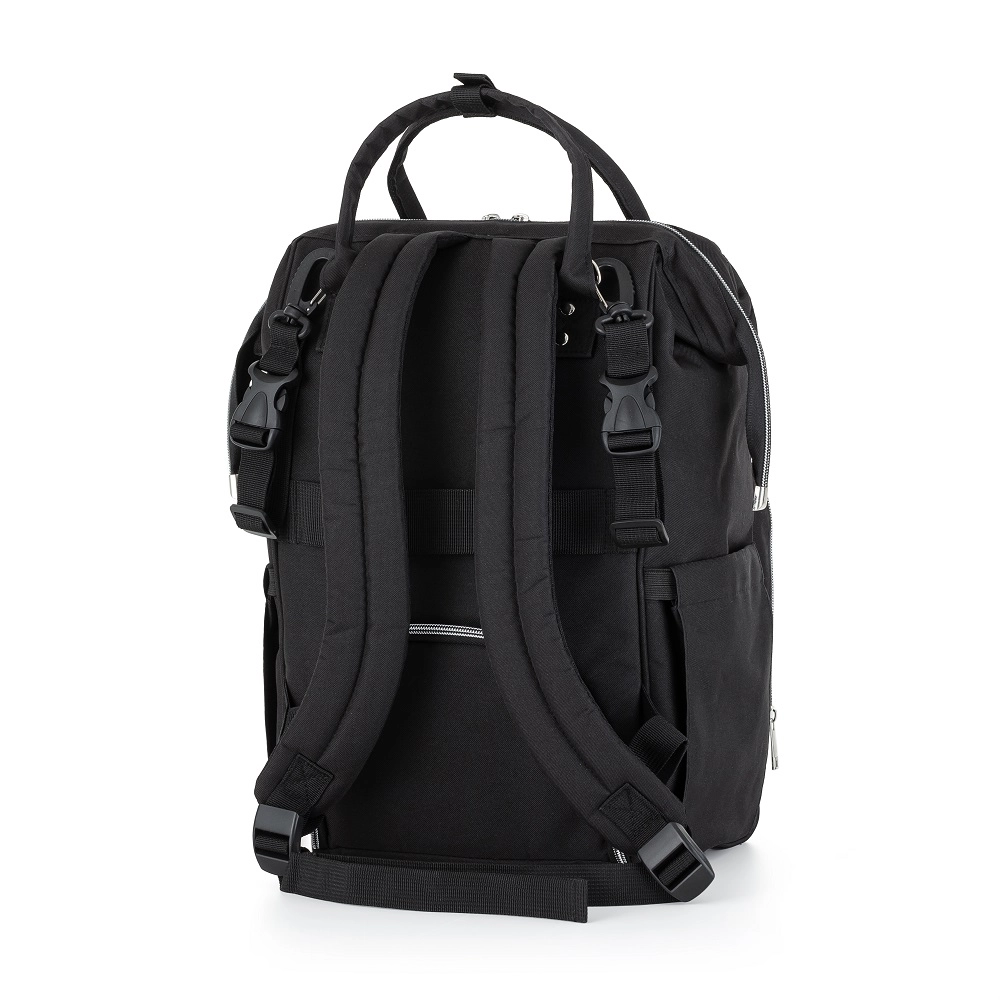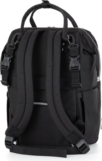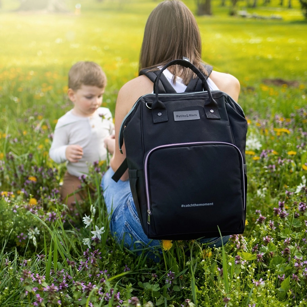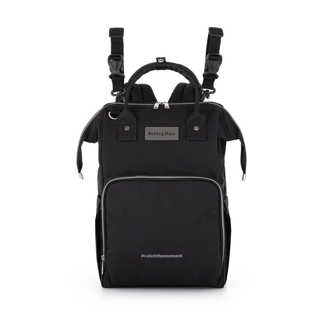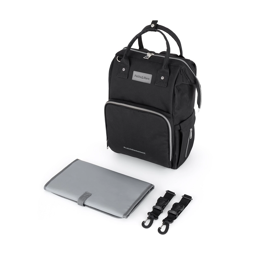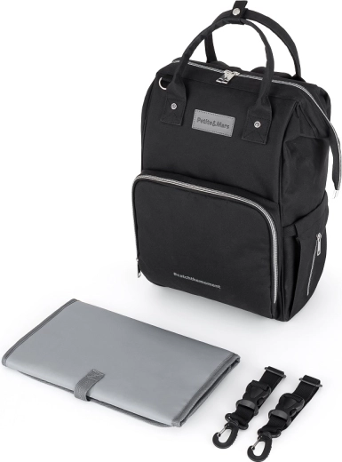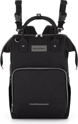 The stylish and functional diaper backpack PETITE&MARS Jack in Just Black is a master of organization for everyday trips with your baby. It offers a spacious interior, 11 pockets including thermal pockets, waterproof pockets for wet items, and quick access via side and back zippers. Includes a changing mat and stroller straps, weighs only 800 g, and features a durable, easy-care design.
