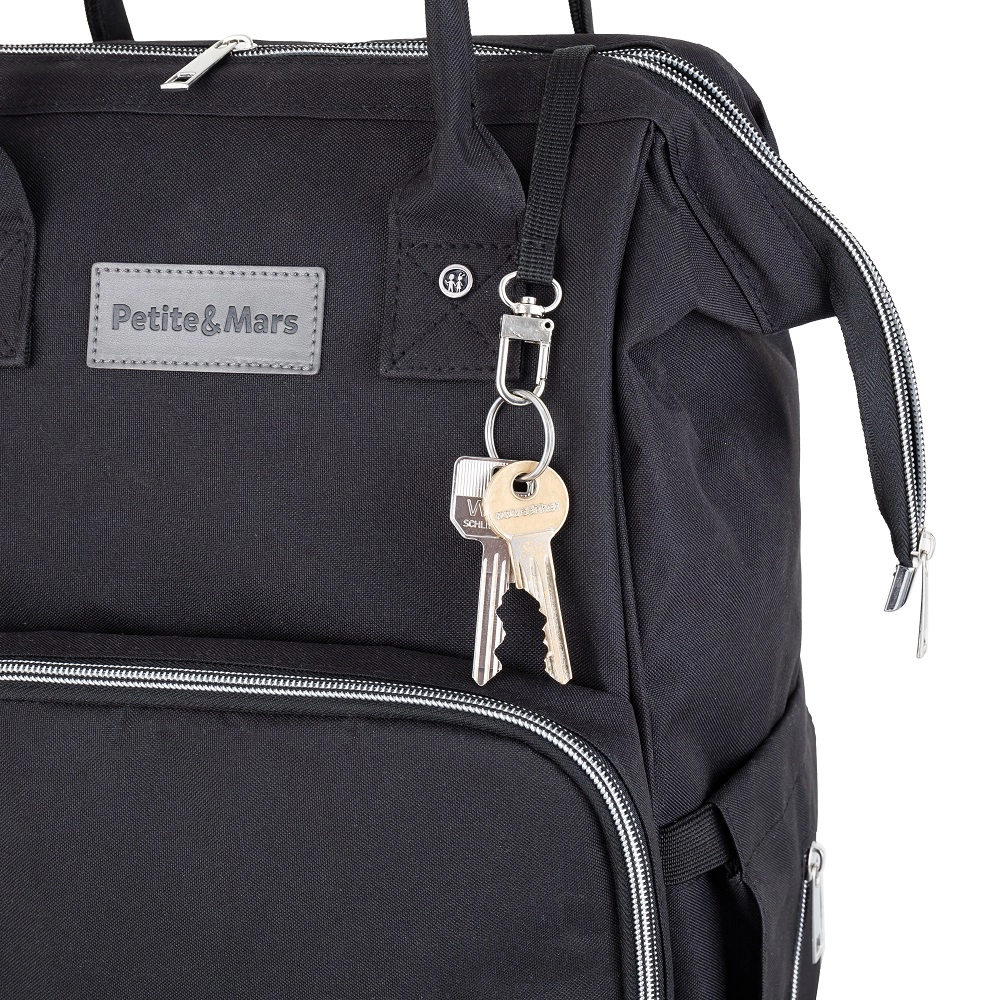 Enjoy thoughtful details: two thermal pockets keep bottles at the right temperature, a waterproof pocket safely separates wet items, a key leash speeds up finding your keys, and the back zipper gives lightning-fast access to the main compartment. Attach the backpack to a stroller or suitcase handle with ease, and find what you need quickly thanks to the light-colored lining.
