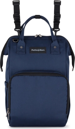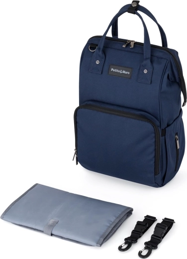 The stylish and functional Petite&Mars Jackob stroller diaper backpack in dark blue offers lightweight design, excellent organization, and durable, moisture-resistant materials. With 11 pockets, including thermal pockets, a waterproof pocket for wet items, and quick side access, you’ll have everything for baby and parents at hand. It includes a changing mat, attaches easily to the stroller, and weighs only 800 g.