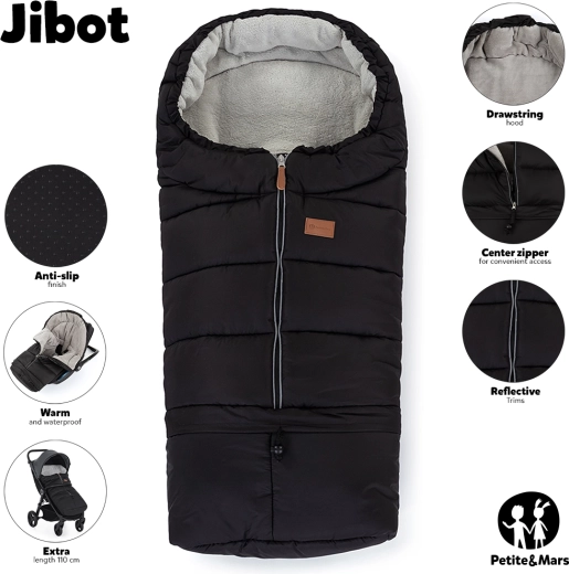The Footmuff 3-in-1 PETITE&MARS Jibot Horizontal Ink Black is designed for maximum comfort from birth up to around 3 years. Thanks to its water-resistant and windproof outer with a 1000 mm water column and a soft fleece lining, your child stays warm and dry even in poor weather. Horizontal harness openings let you thread the straps without disconnecting them, increasing compatibility with strollers and car seats from various brands.