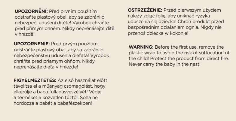 Remove the plastic packaging before use; keep away from fire; never carry a child in the nest