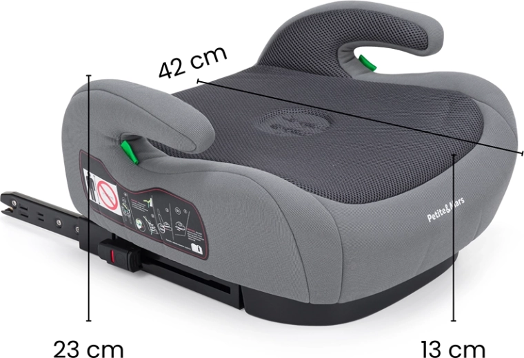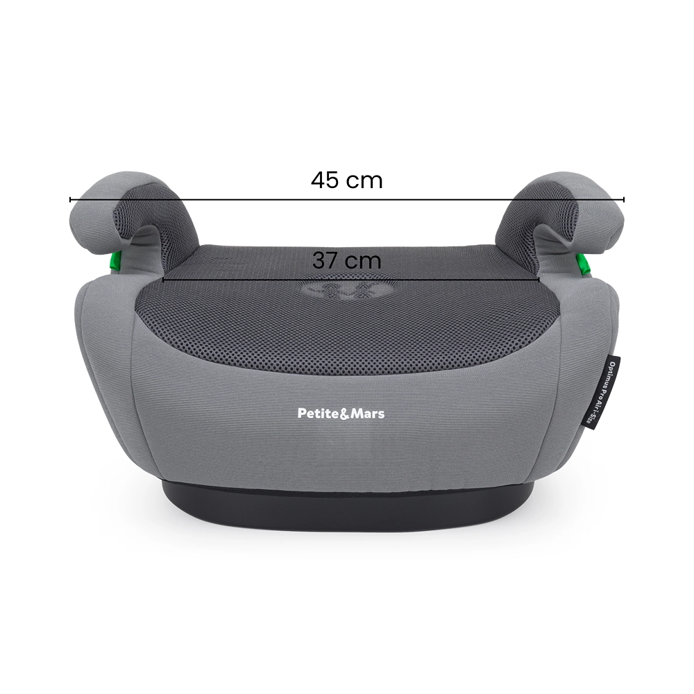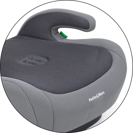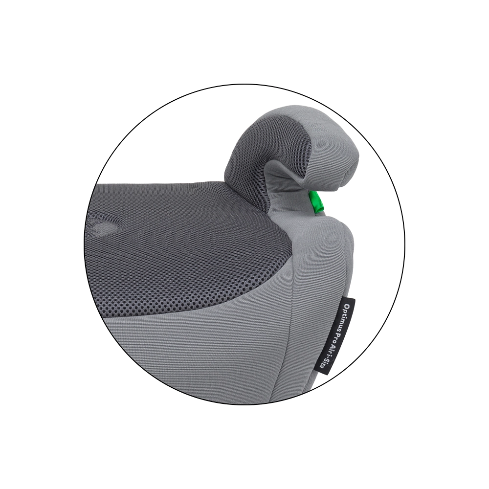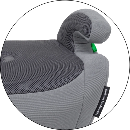 The PETITE&MARS Optimus Pro i-Size Grey Air booster is a reliable solution for older children who already use the vehicle’s three-point seat belt. Thanks to the sturdy ISOFIX anchorage made of stainless steel, it remains stable even during sudden braking and helps set the seating height for safe belt routing.