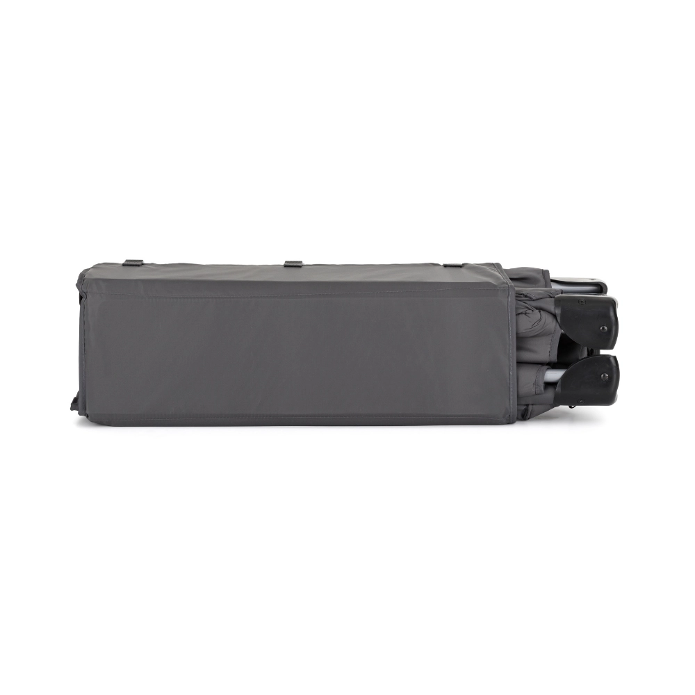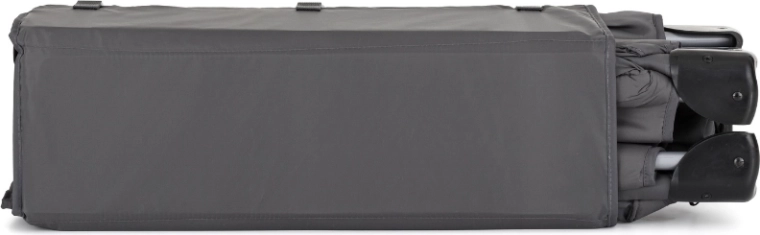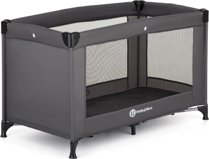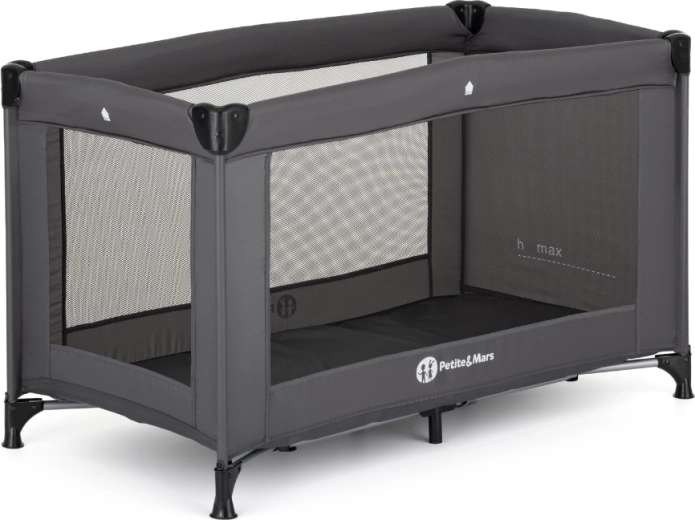 The lightweight and compact PETITE&MARS Koot Lite travel cot in elegant dark grey is ideal for trips and home alike. It offers a stable metal frame, breathable mesh sides for better air circulation, and a Double Lock safety system to prevent accidental folding. It folds easily, fits into the carry bag, and is suitable for children up to 15 kg.