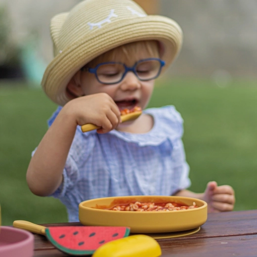 The sturdy suction base keeps the plate fixed to the table or highchair, so it won’t slide or tip during meals. Perfect for the first steps toward independent feeding.