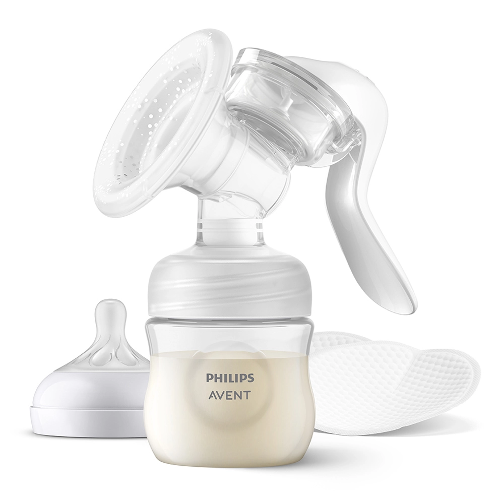 The PHILIPS AVENT manual pump is designed for comfortable, natural, and discreet expression of breast milk at home or on the go. A combination of effective vacuum and gentle nipple stimulation supports a smooth milk flow and a pleasant, breastfeeding-like feel. Its compact size and low weight make one-handed operation easy.