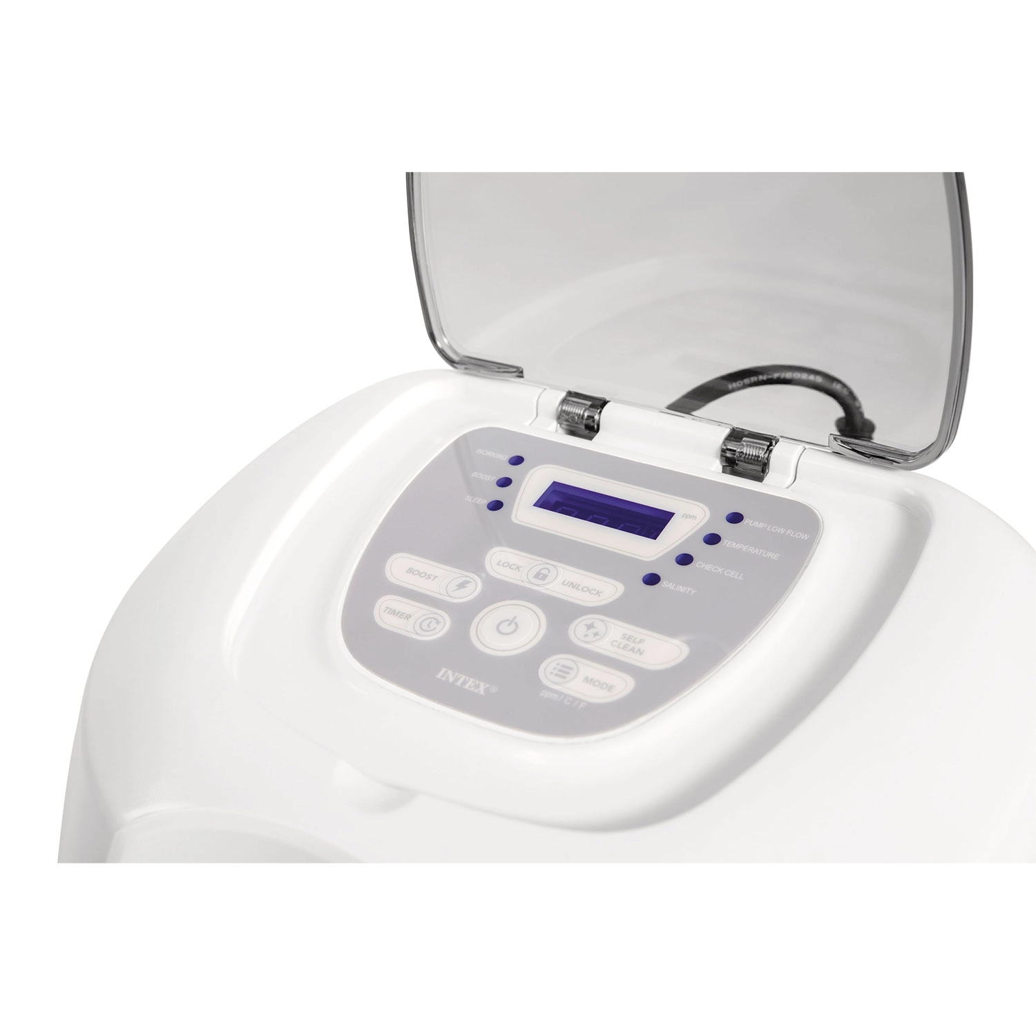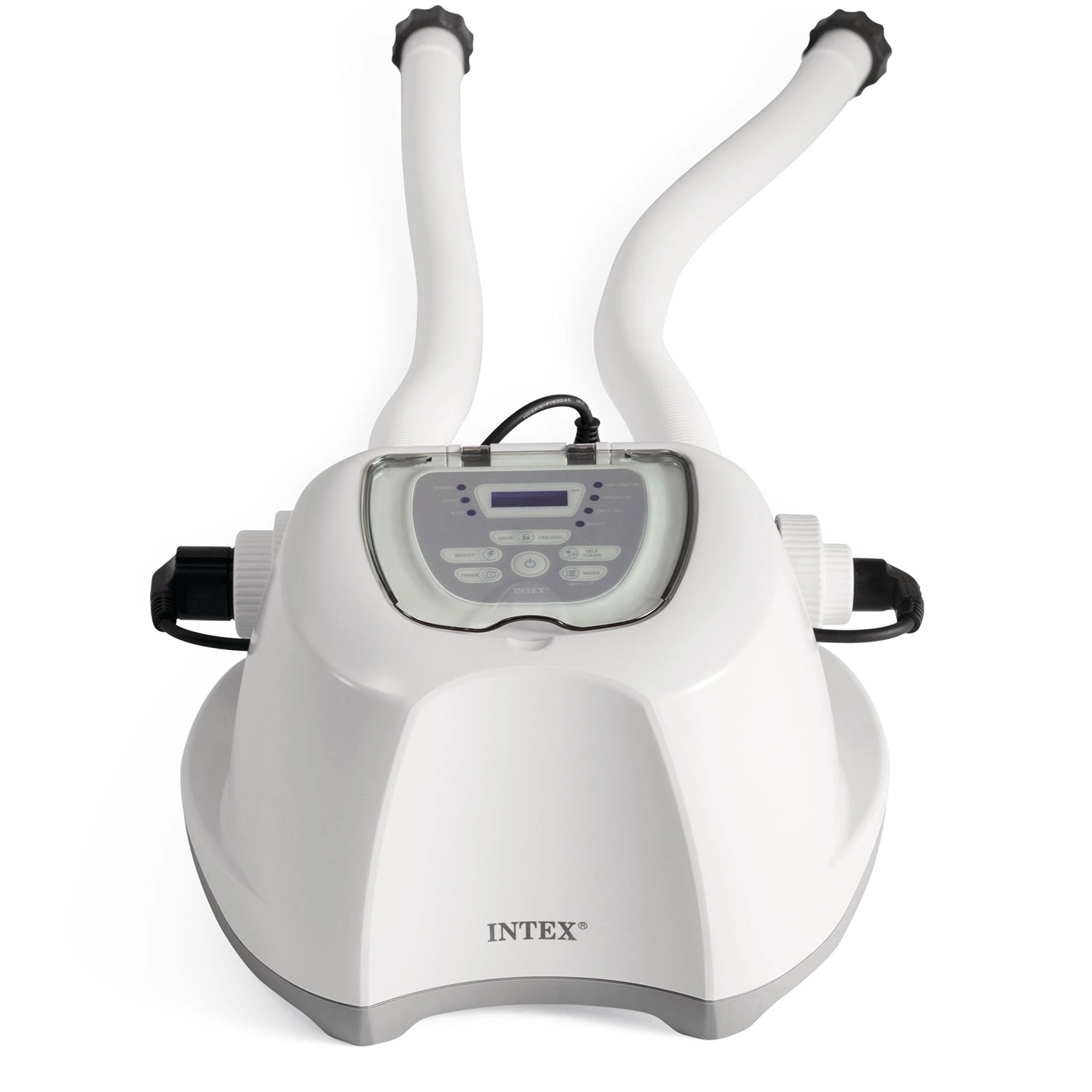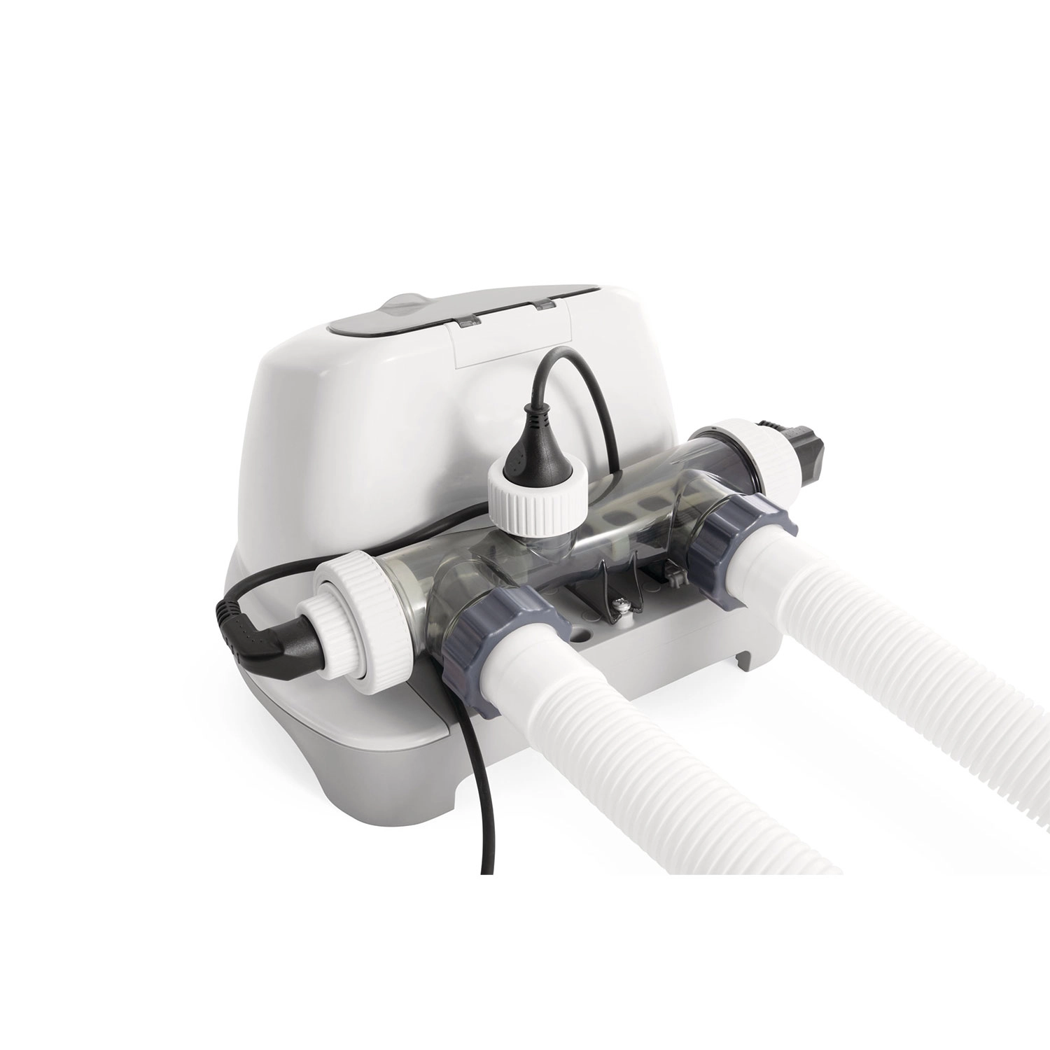 With a capacity of 7 g/h, it’s suitable for above-ground pools up to 26,500 l. Simple operation is ensured by a clear panel with Boost and Self Clean functions, plus a 24-hour programmable timer for automatic operation. For proper function, connect to a filter pump with a flow rate of 2,650–12,112 l/h.