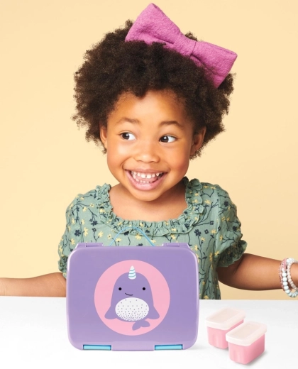 A practical and adorable narwhal-themed bento lunch box from Skip Hop will delight every little eater. Thanks to its multi-compartment design and two separate containers, it keeps foods separated and fresh. Secure sealing prevents leaks, kid-friendly latches are easy to use, and the removable tray and containers are dishwasher safe. Ideal for school, clubs, and trips.