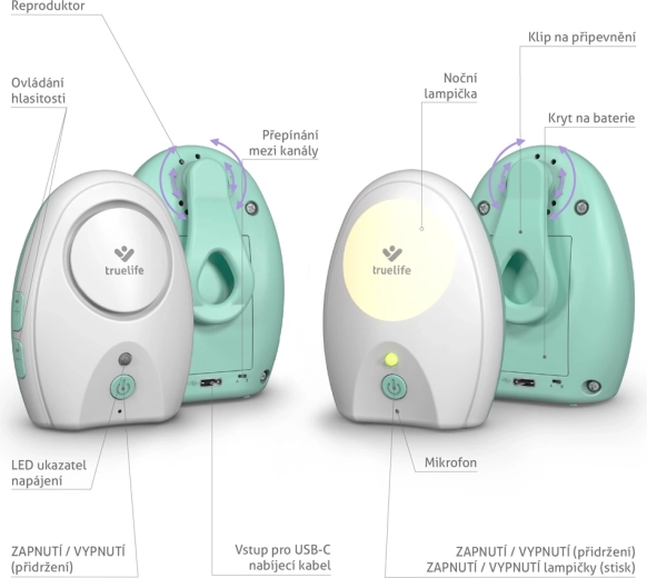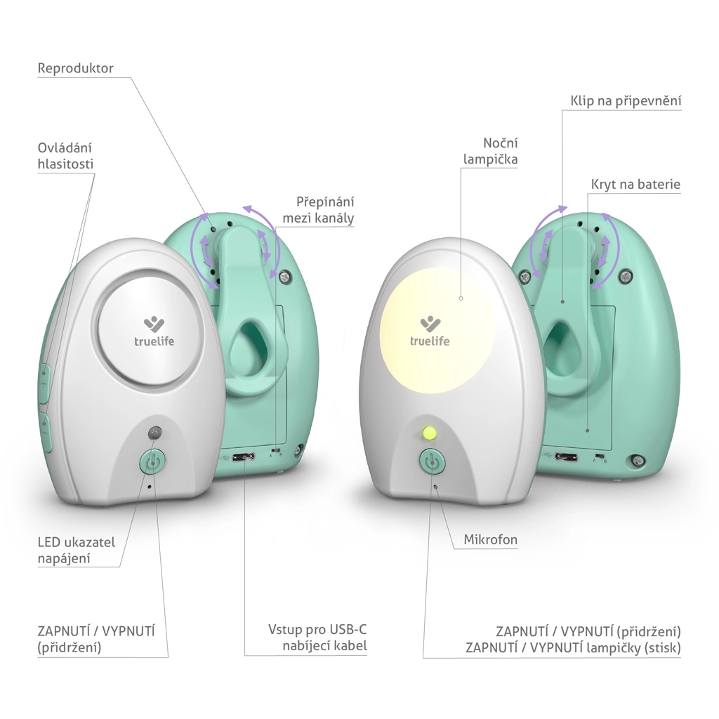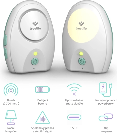 The TrueLife NannyTone VM Pocket is a compact digital audio baby monitor designed for confidence and convenience. Stable transmission on two frequency channels, a range of up to 700 m in open space, and a signal loss alert only on the parent unit ensure your baby won’t be disturbed. Rechargeable batteries in both units and universal USB‑C power let you take the monitor anywhere—at home, to the cottage, or on the go.